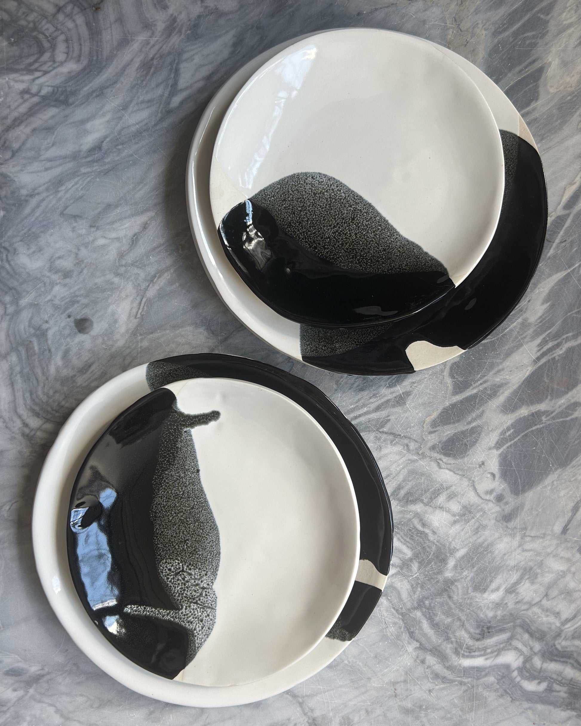 Layers of gloss black and gloss white glaze on red clay base. Each is unique and coordinates well with the Ryman and Moon series.