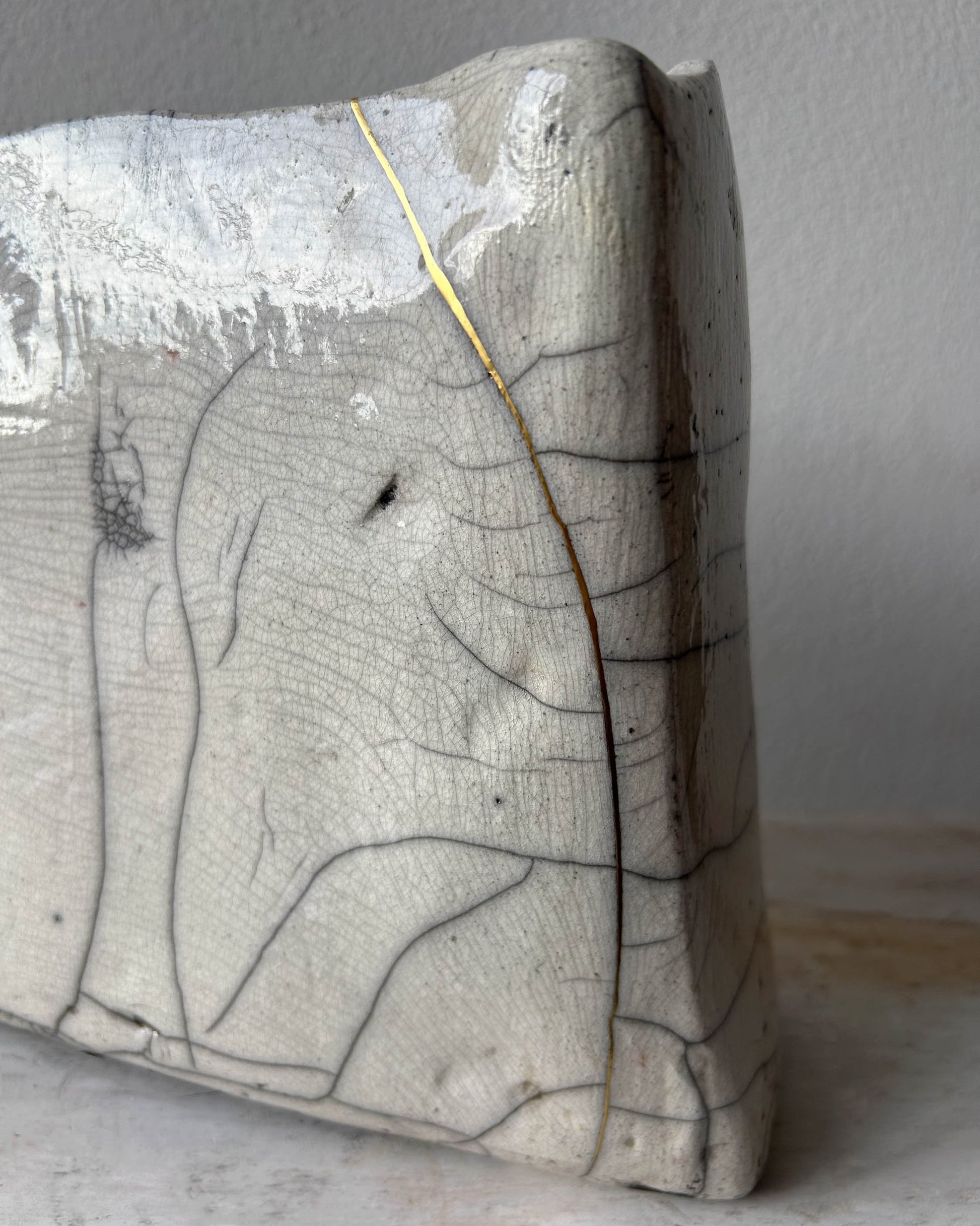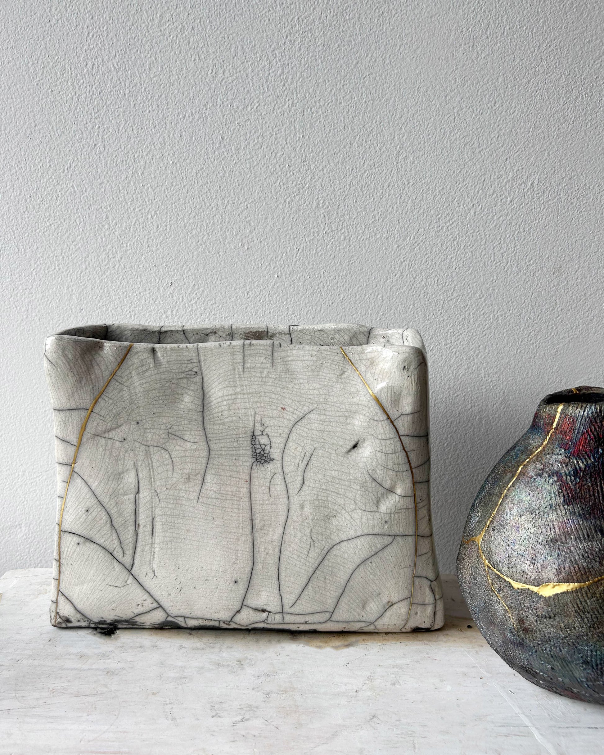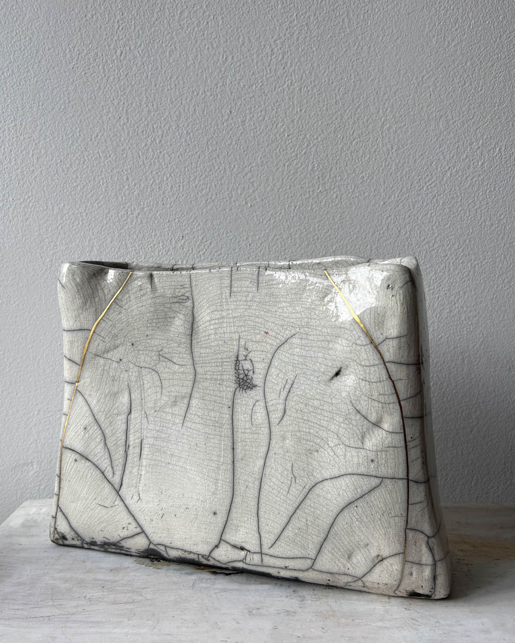 Perfectly wonky narrow rectangular vase built from slabs, and then Raku-fired in a New Jersey back yard with 24 Karat gold Kintsugi repairs on face.
