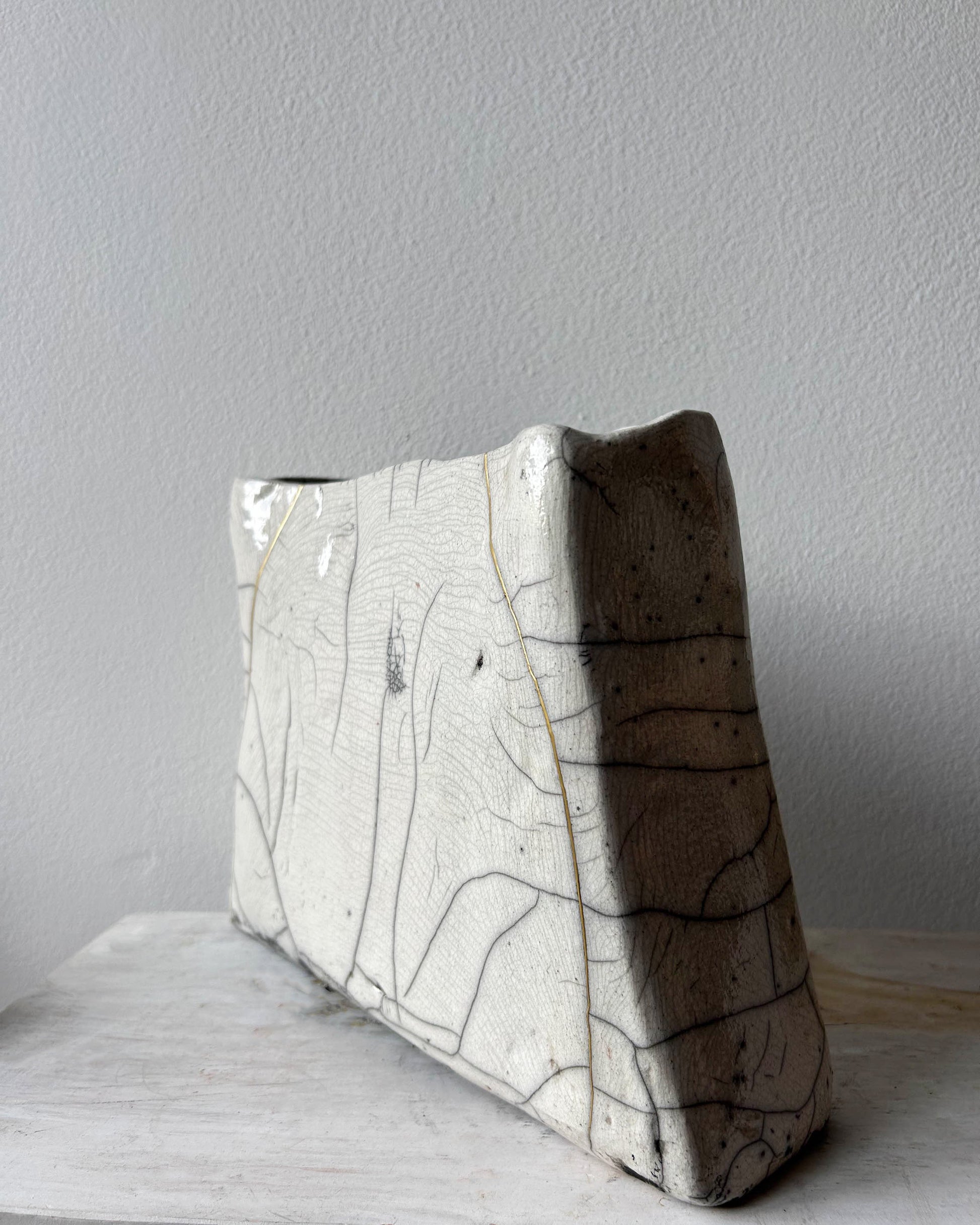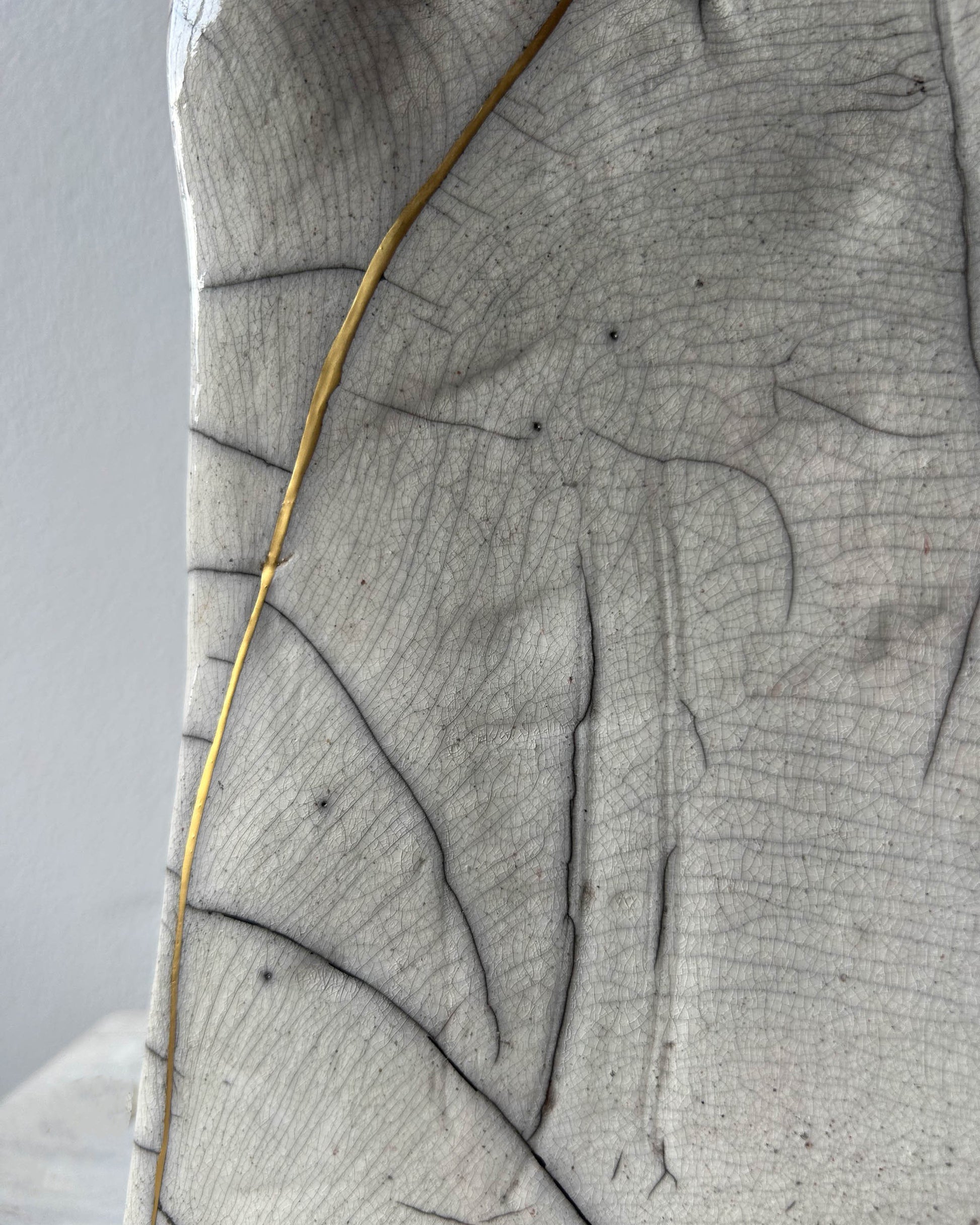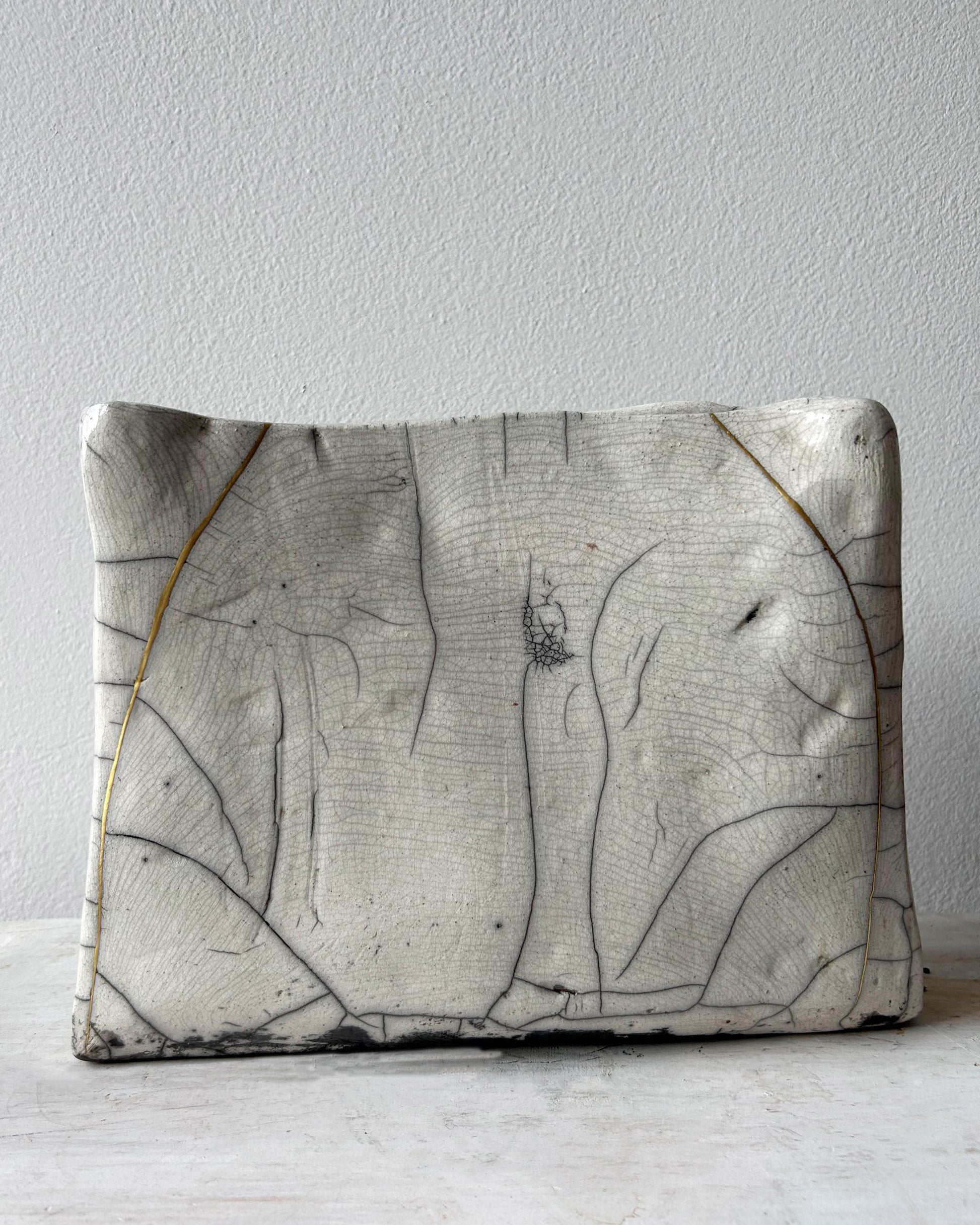 Perfectly wonky narrow rectangular vase built from slabs, and then Raku-fired in a New Jersey back yard with 24 Karat gold Kintsugi repairs on face.