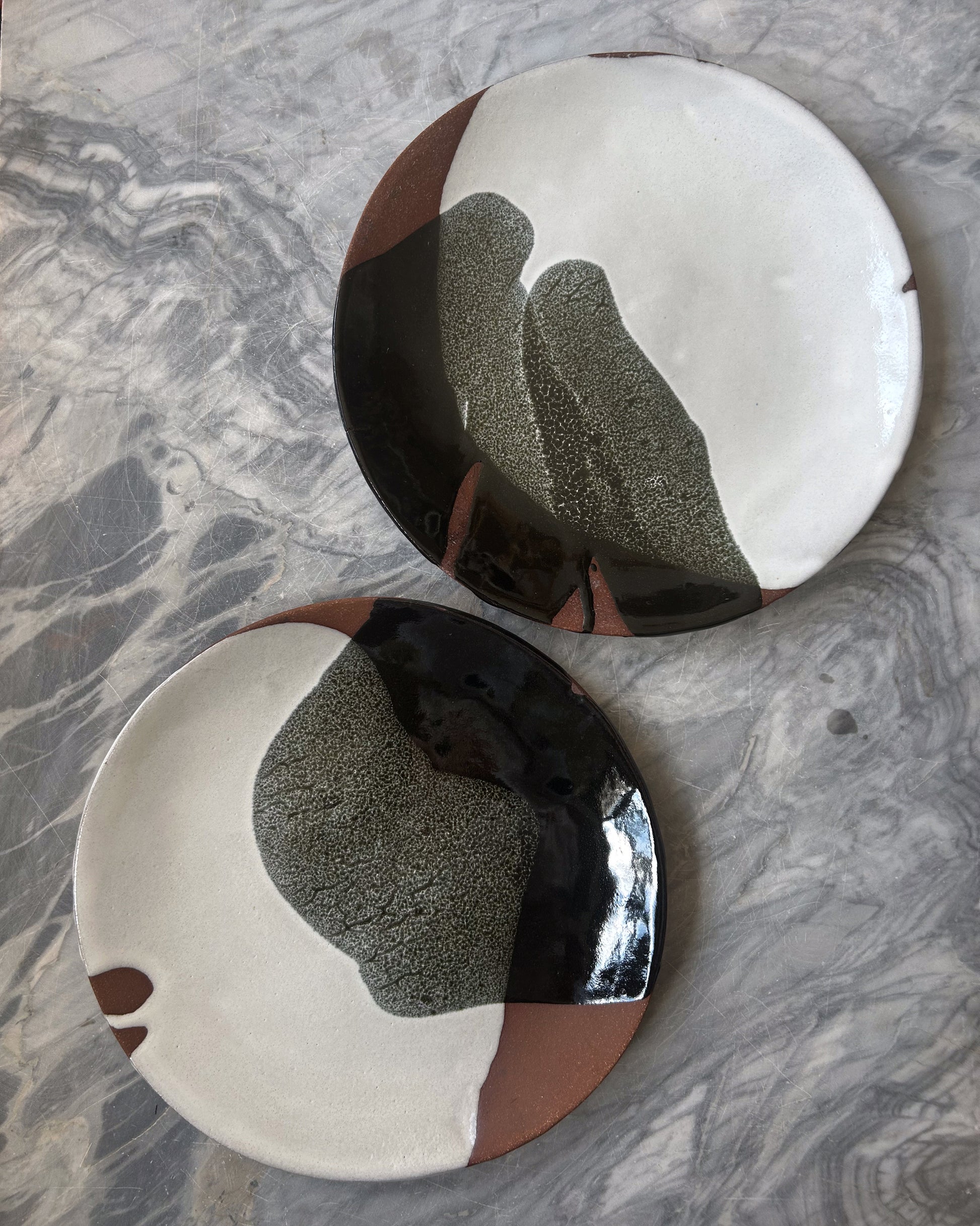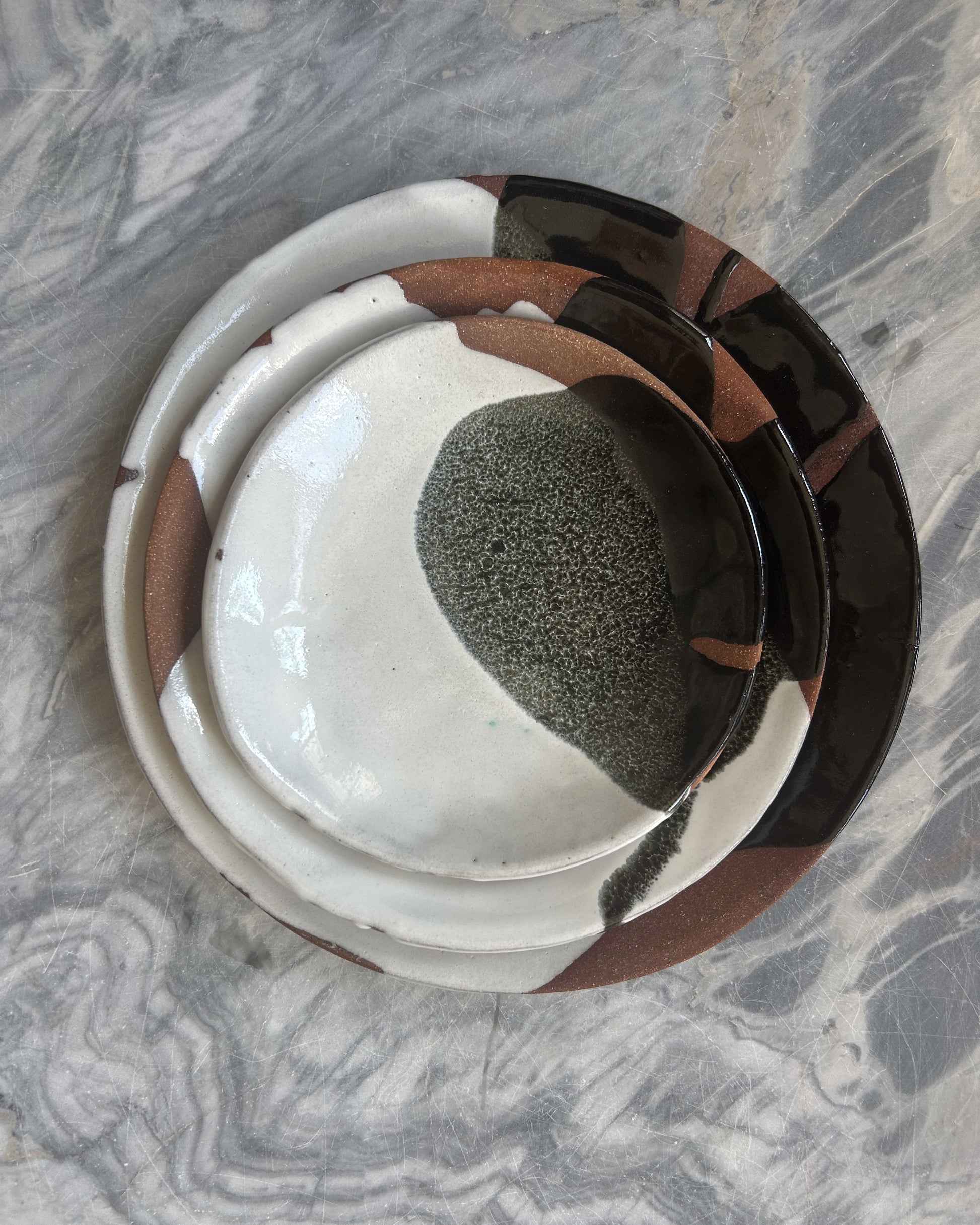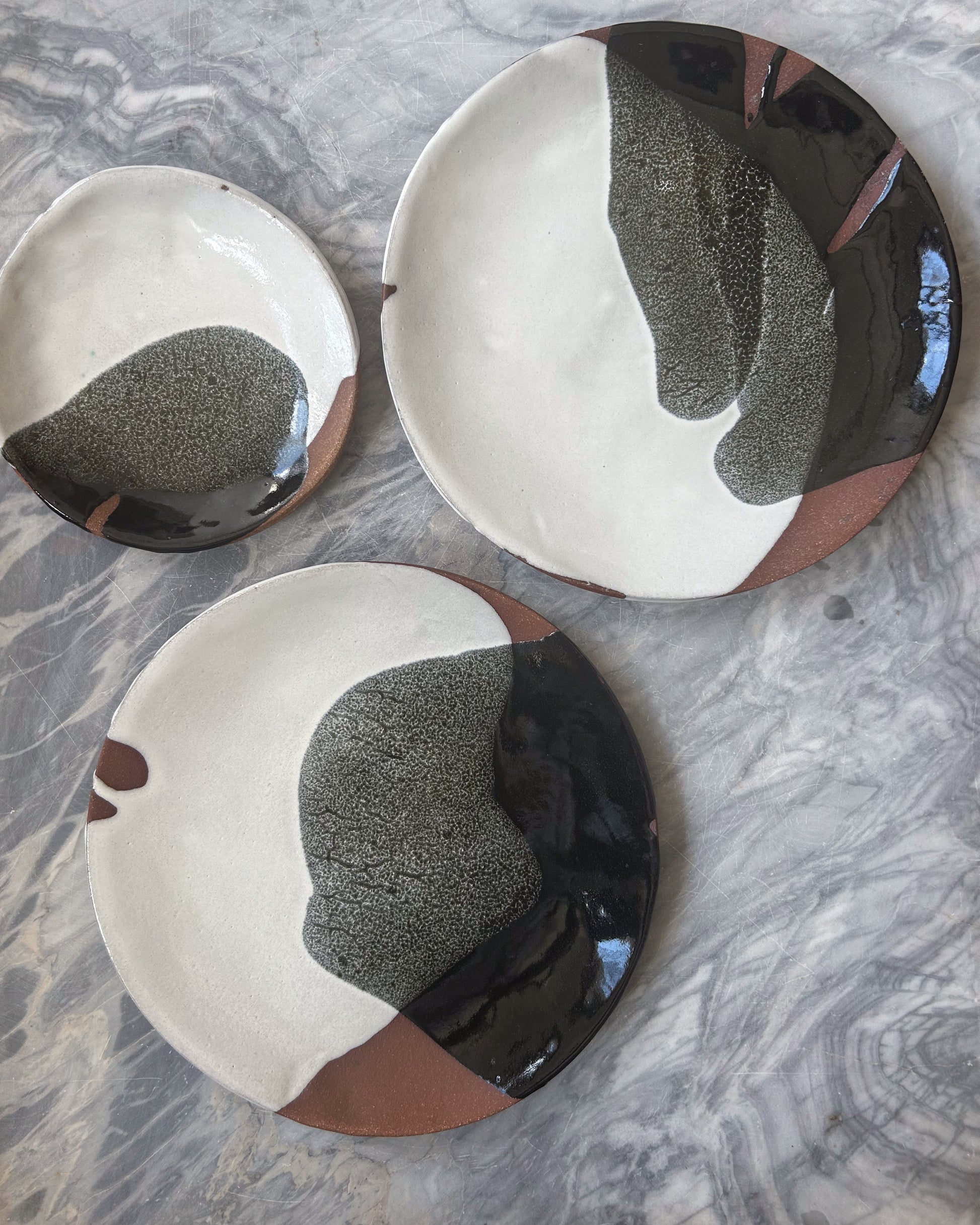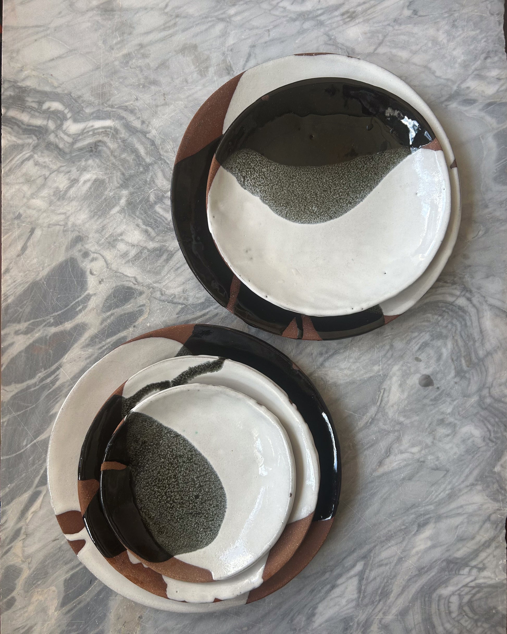 Layers of gloss black and gloss white glaze on red clay base. Each is unique and coordinates well with the Ryman and Moon series.