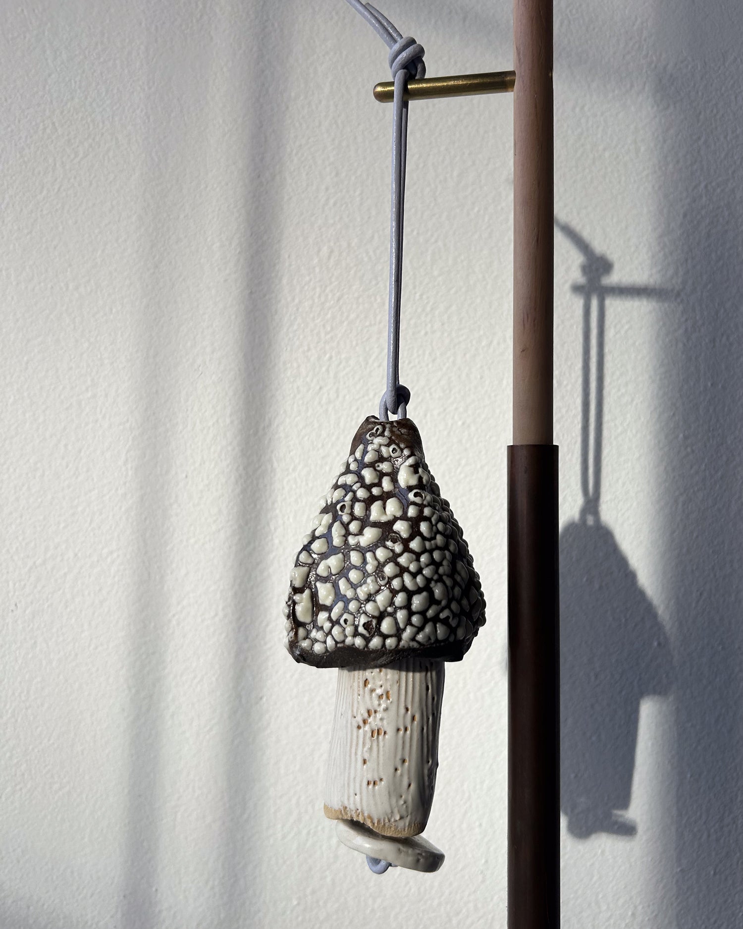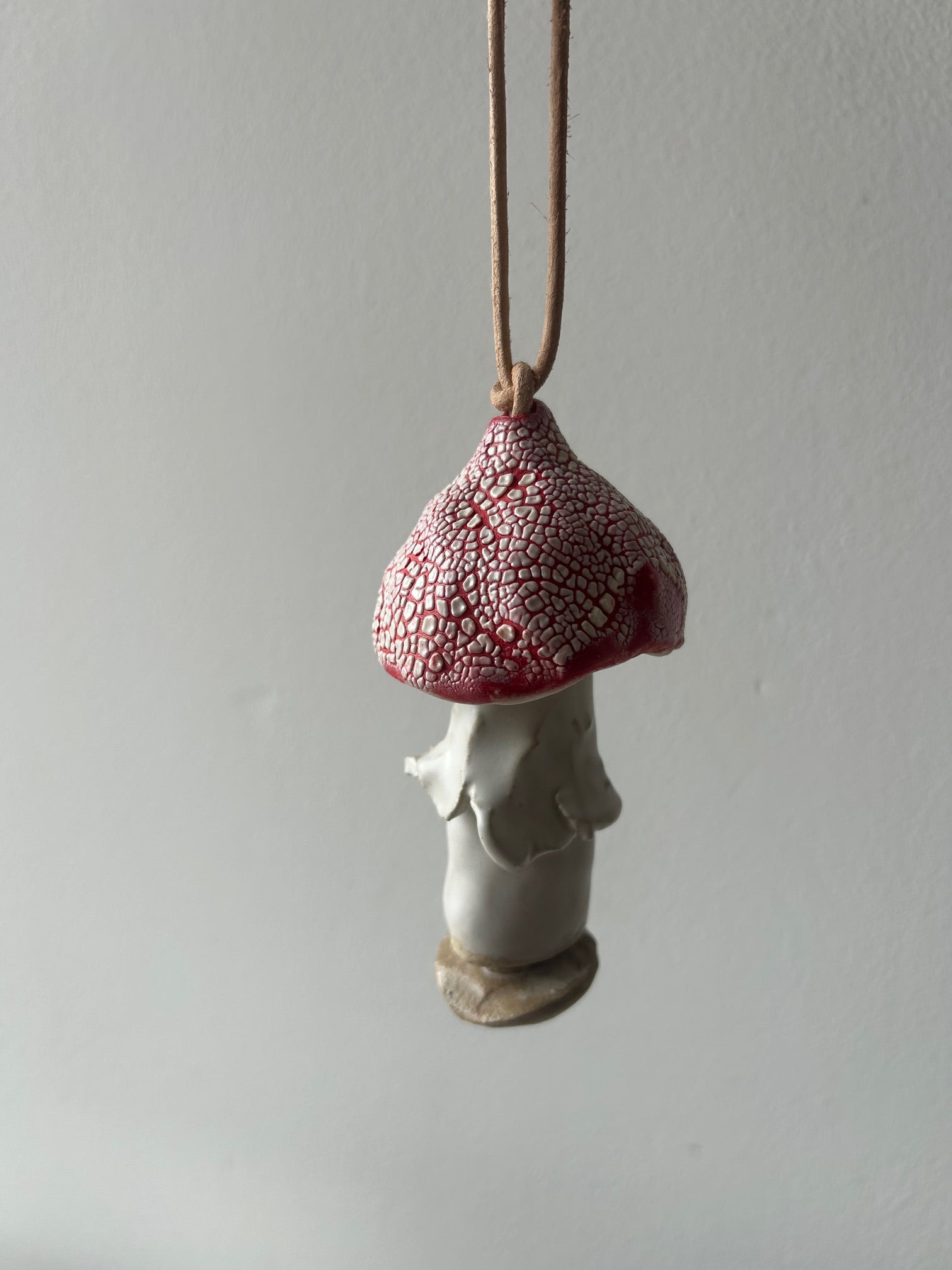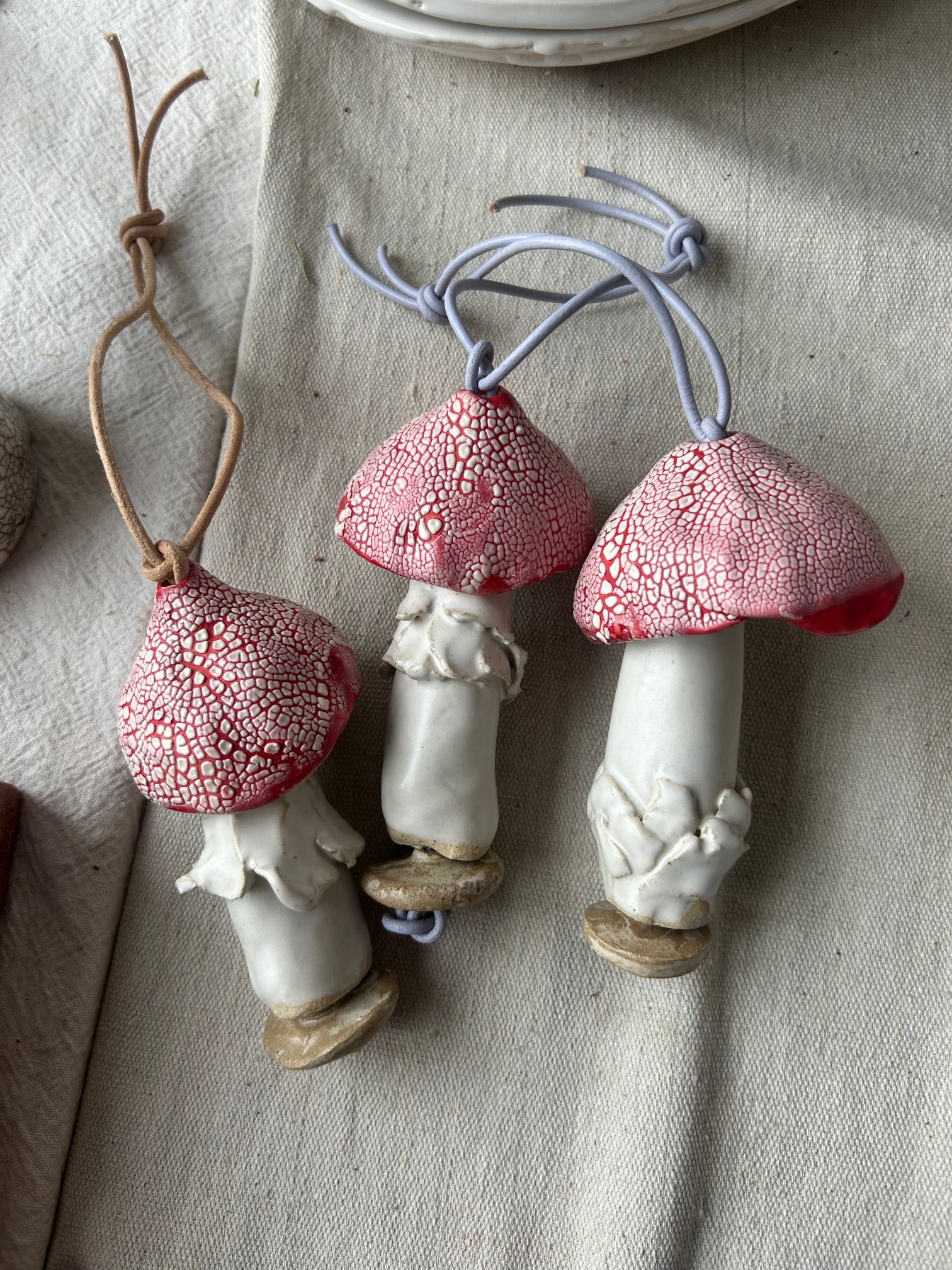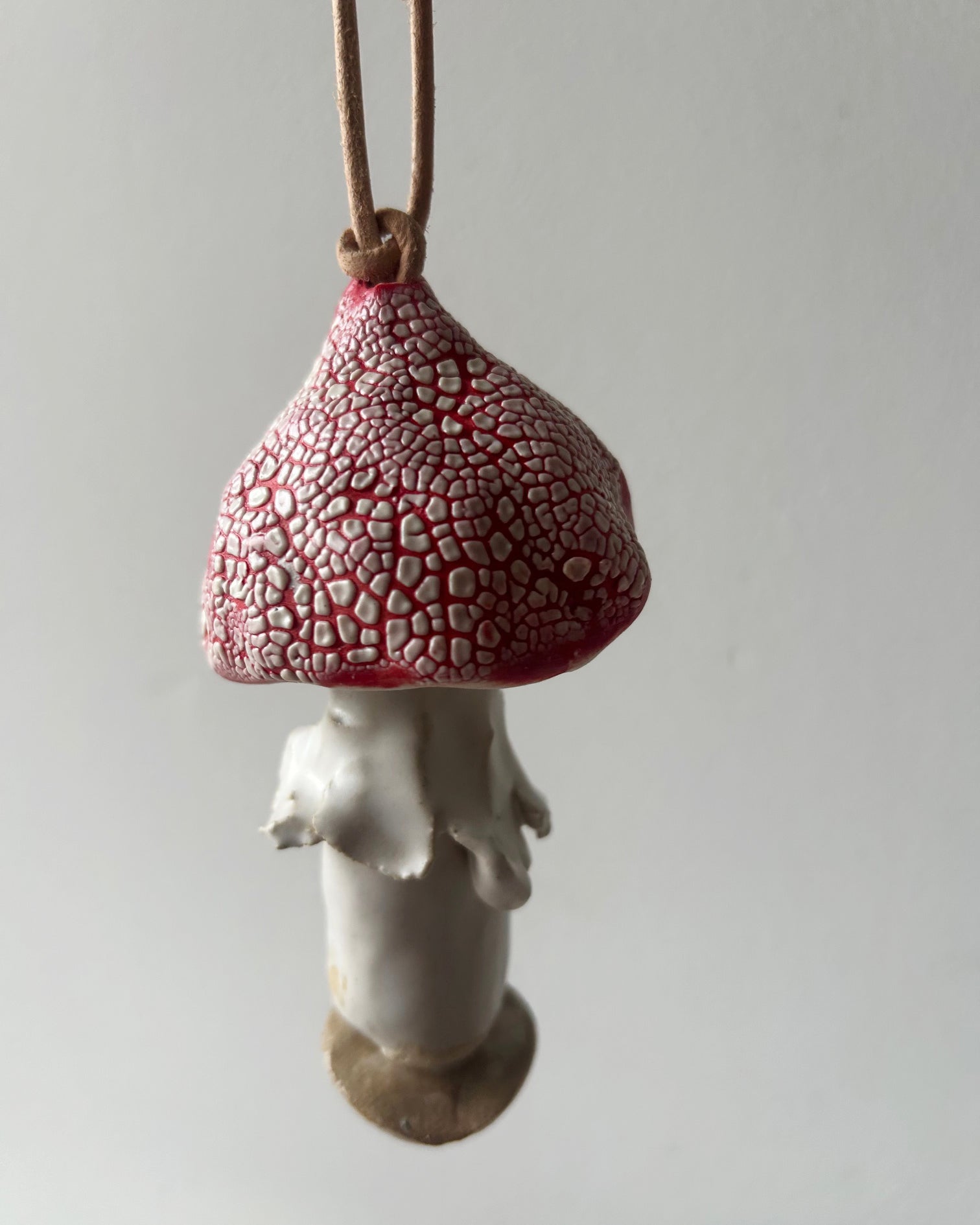 Handcrafted ceramic mushrooms with a one-of-a-kind top, dangling stem and individual bead at the base. Hand assembled with leather cord. Each has it's own unique shape, color and pattern.