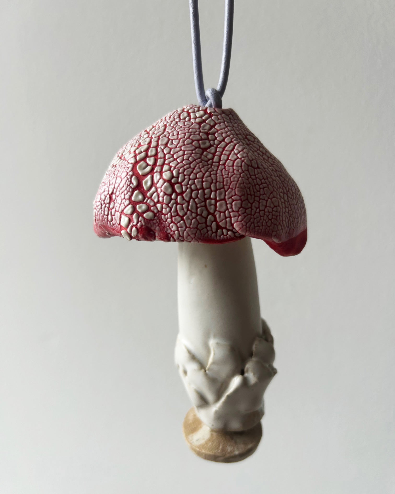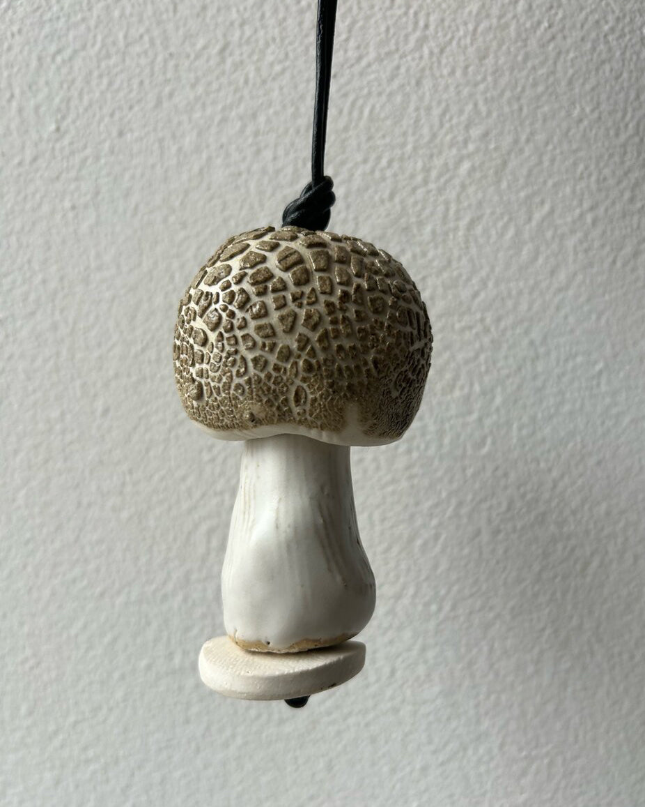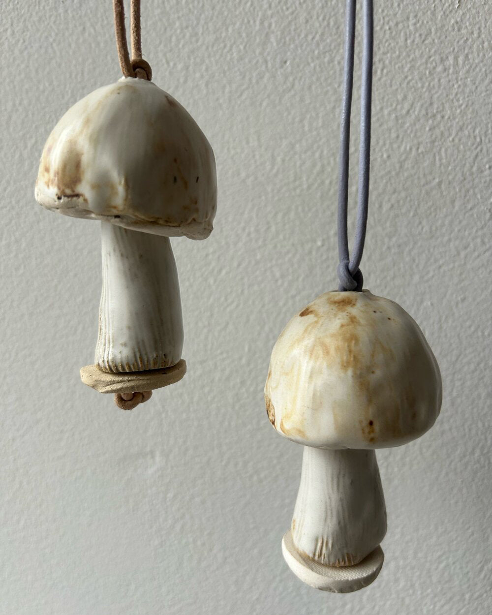 Handcrafted ceramic mushrooms with a one-of-a-kind top, dangling stem and individual bead at the base. Hand assembled with leather cord. Each has it's own unique shape, color and pattern.