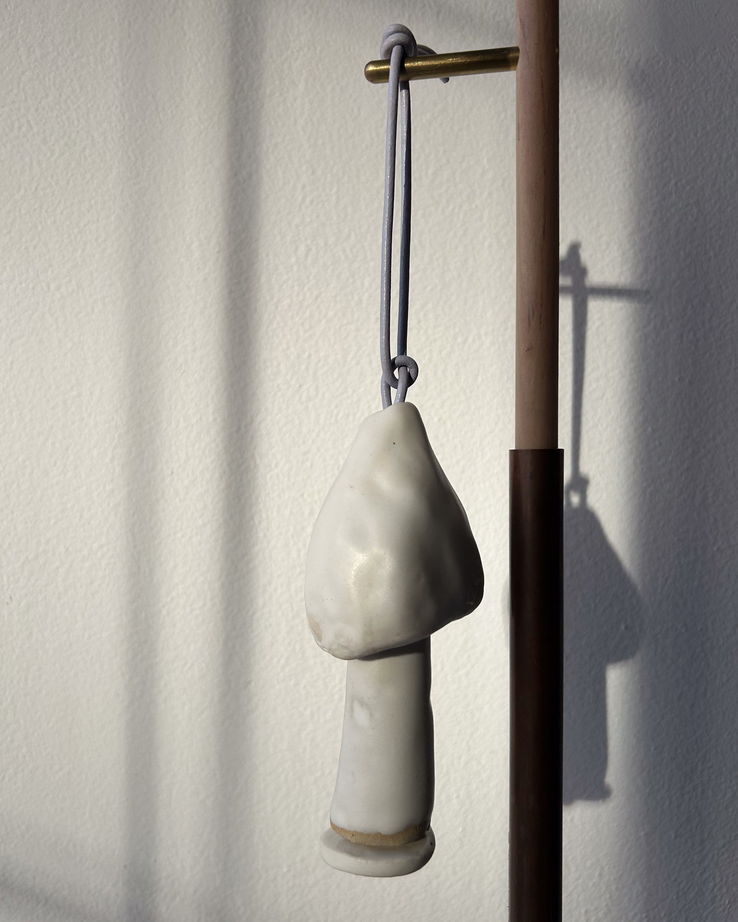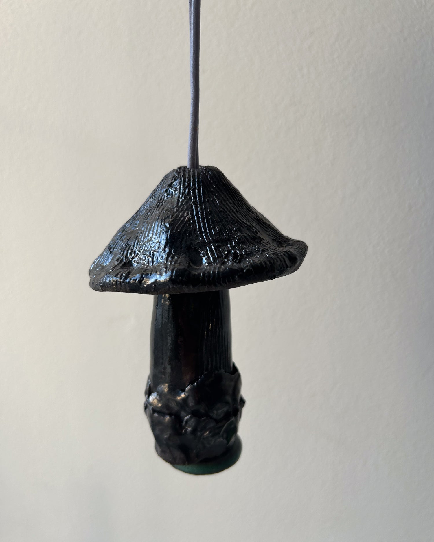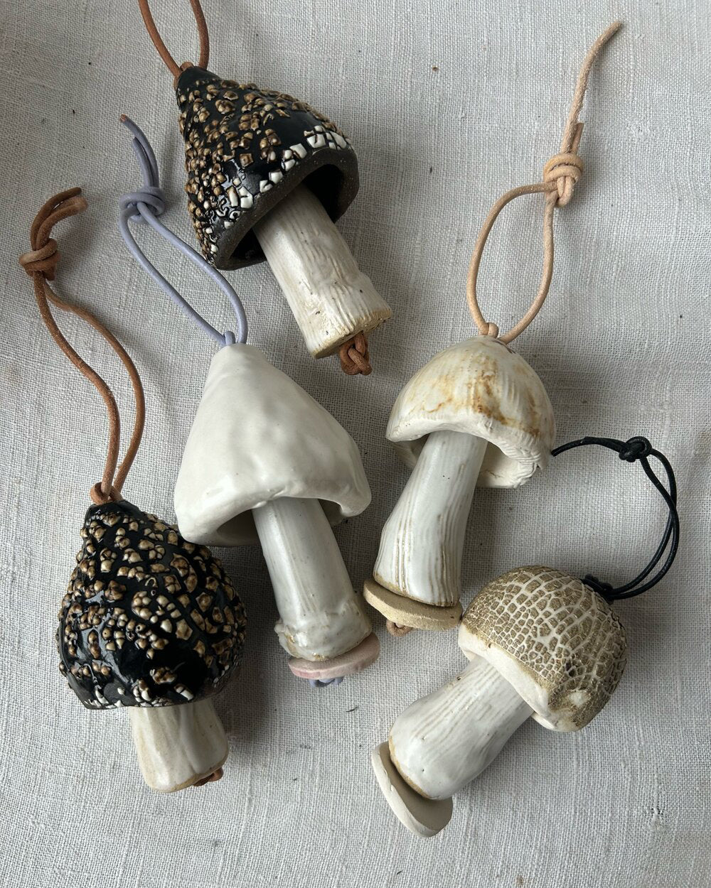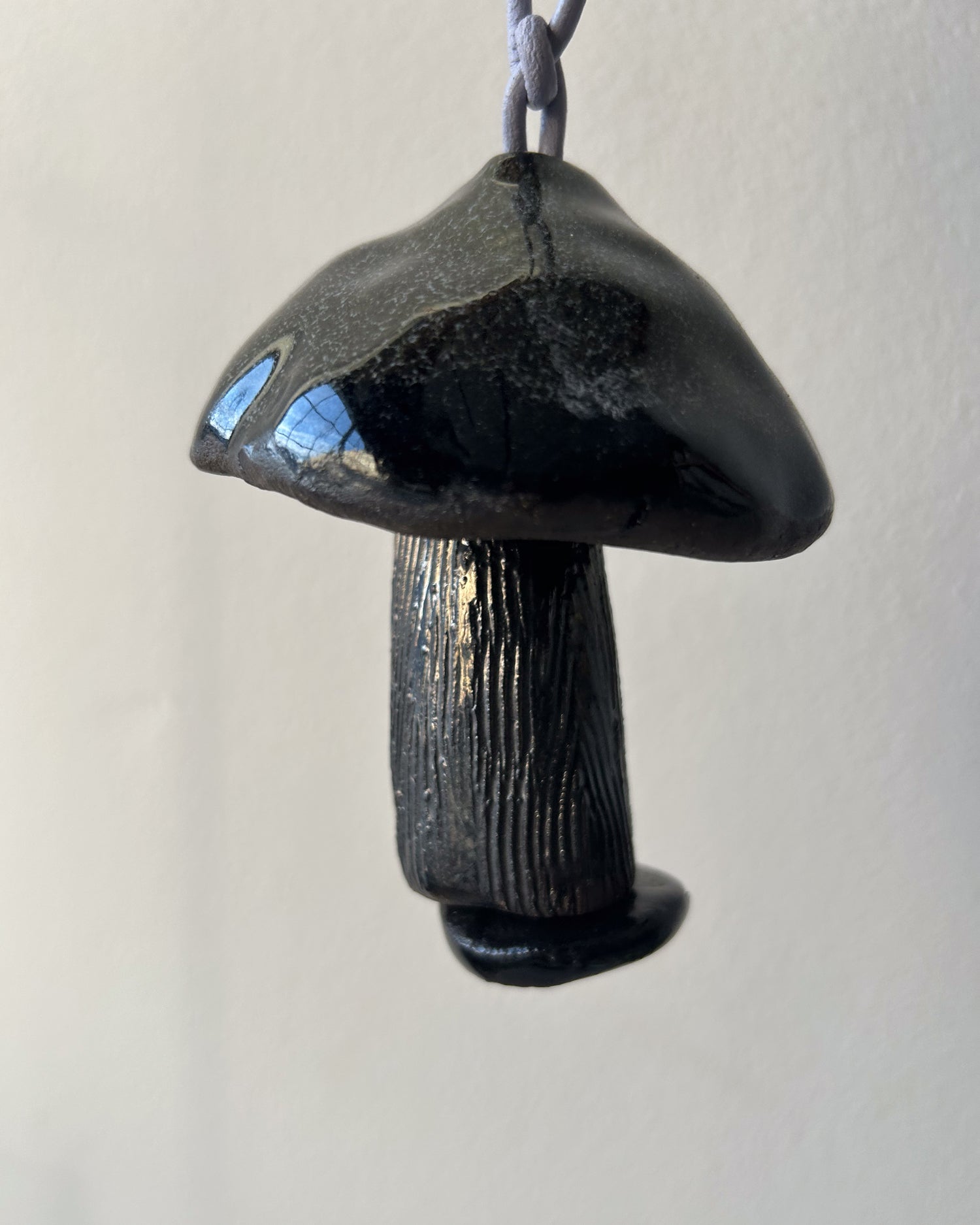 Handcrafted ceramic mushrooms with a one-of-a-kind top, dangling stem and individual bead at the base. Hand assembled with leather cord. Each has it's own unique shape, color and pattern.