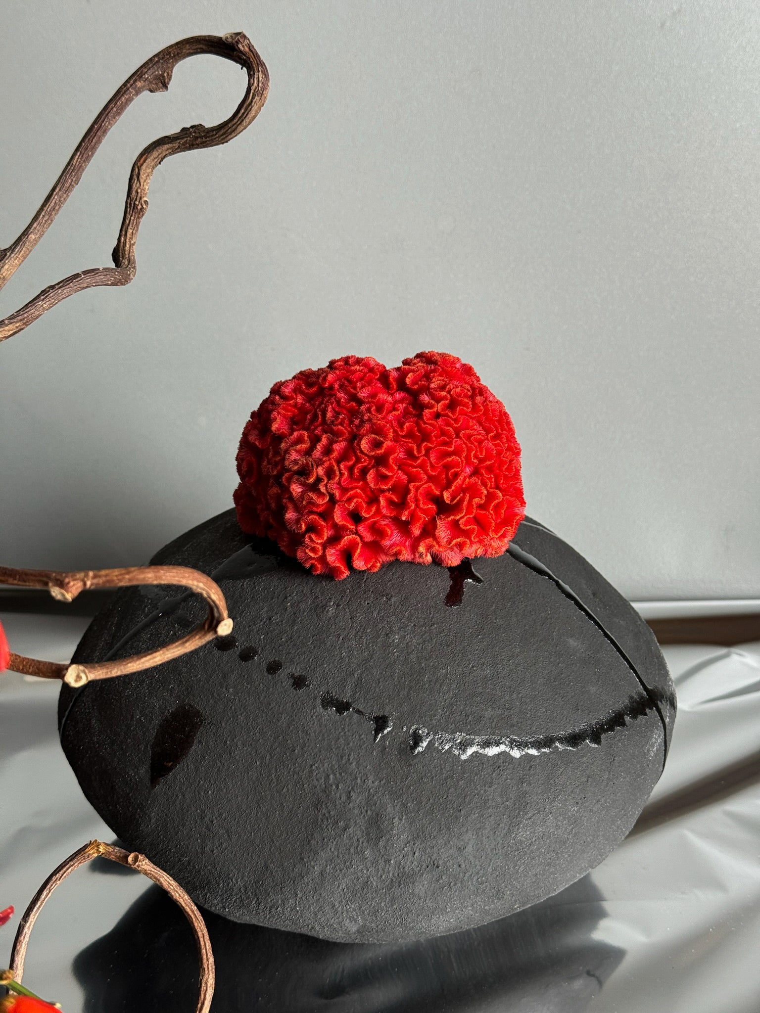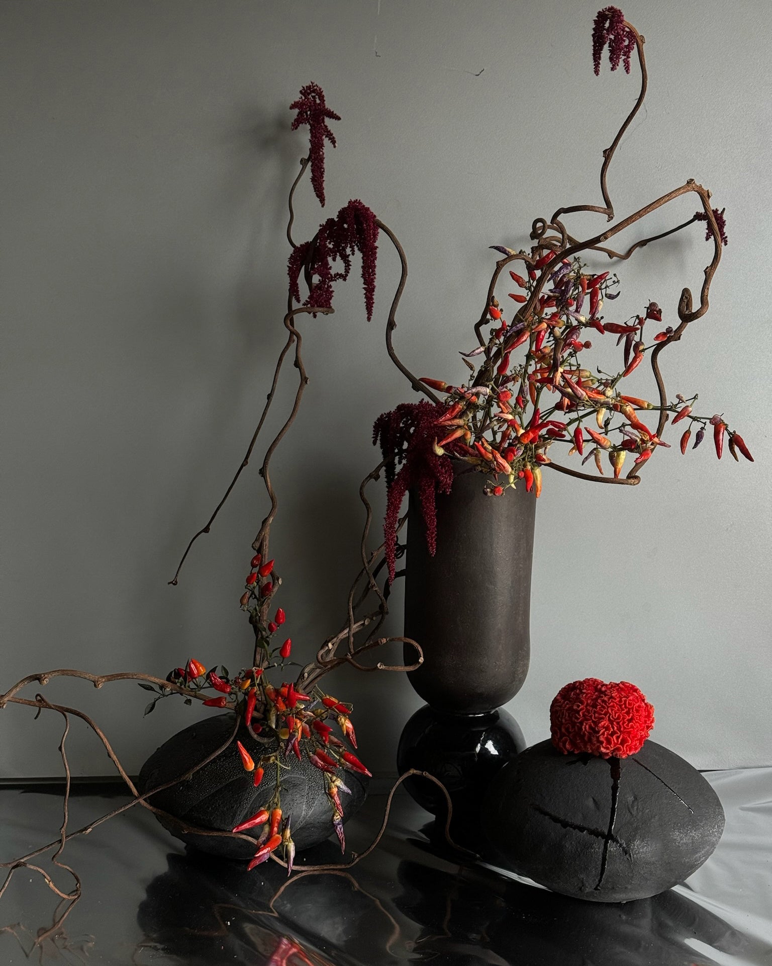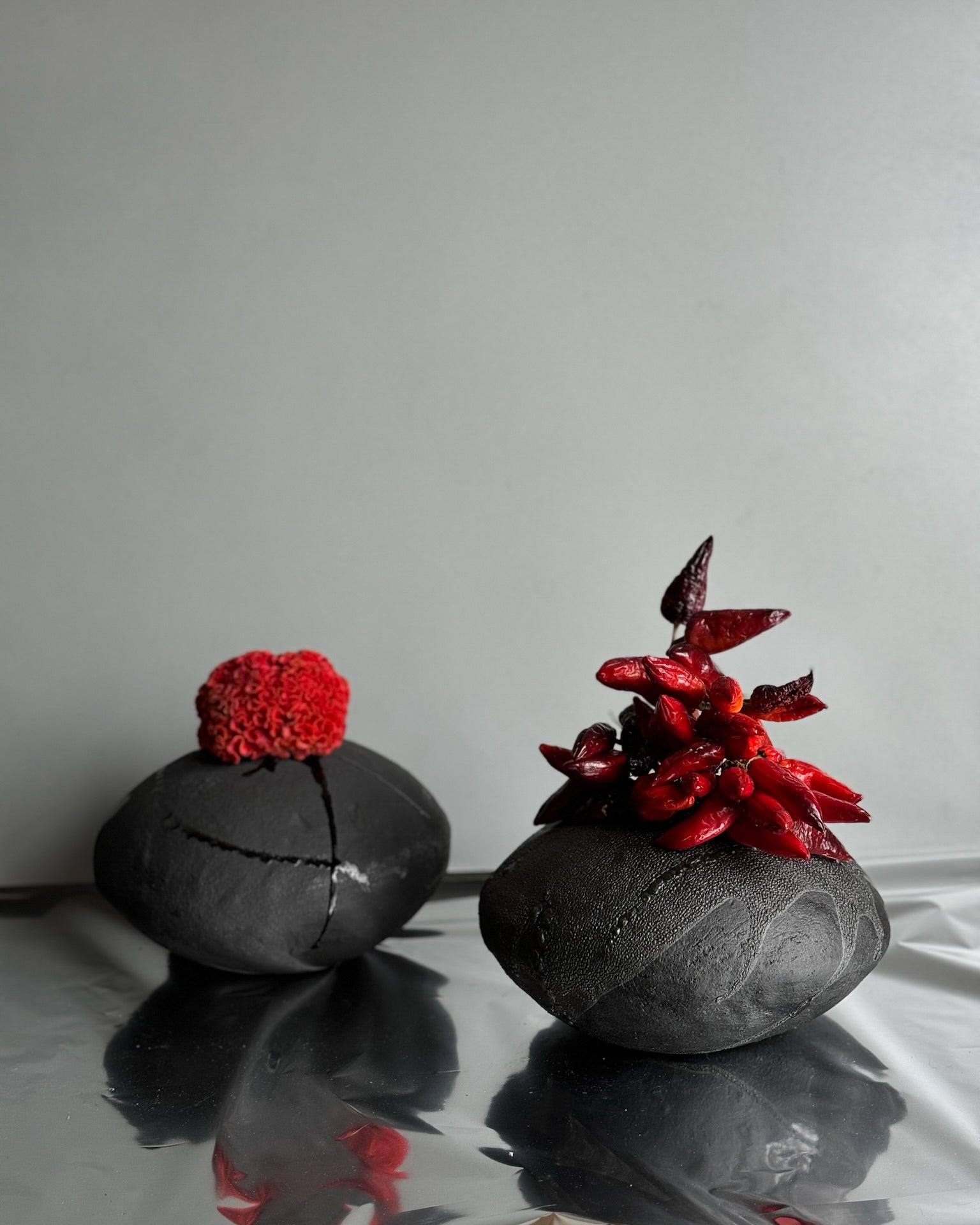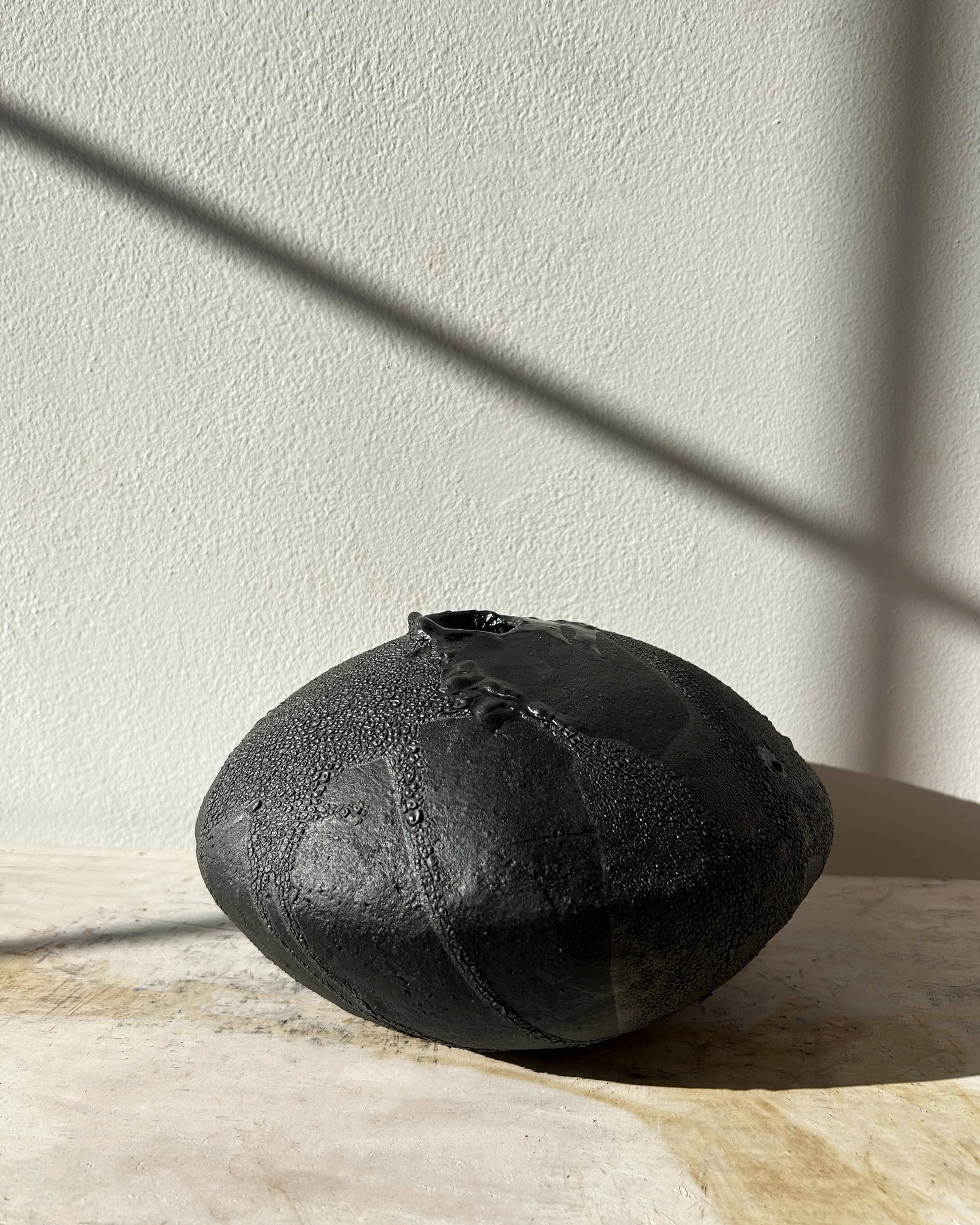 Heavily textured black glaze on an imperfectly round matte-black  surface. Made from groggy sculpture clay in our Brooklyn studio.