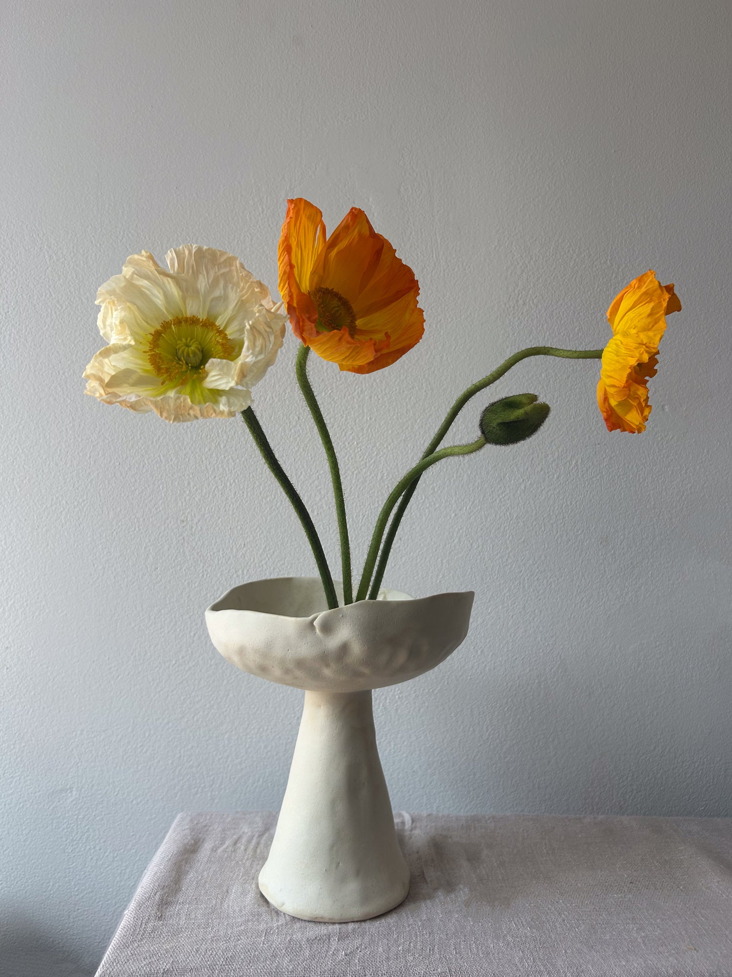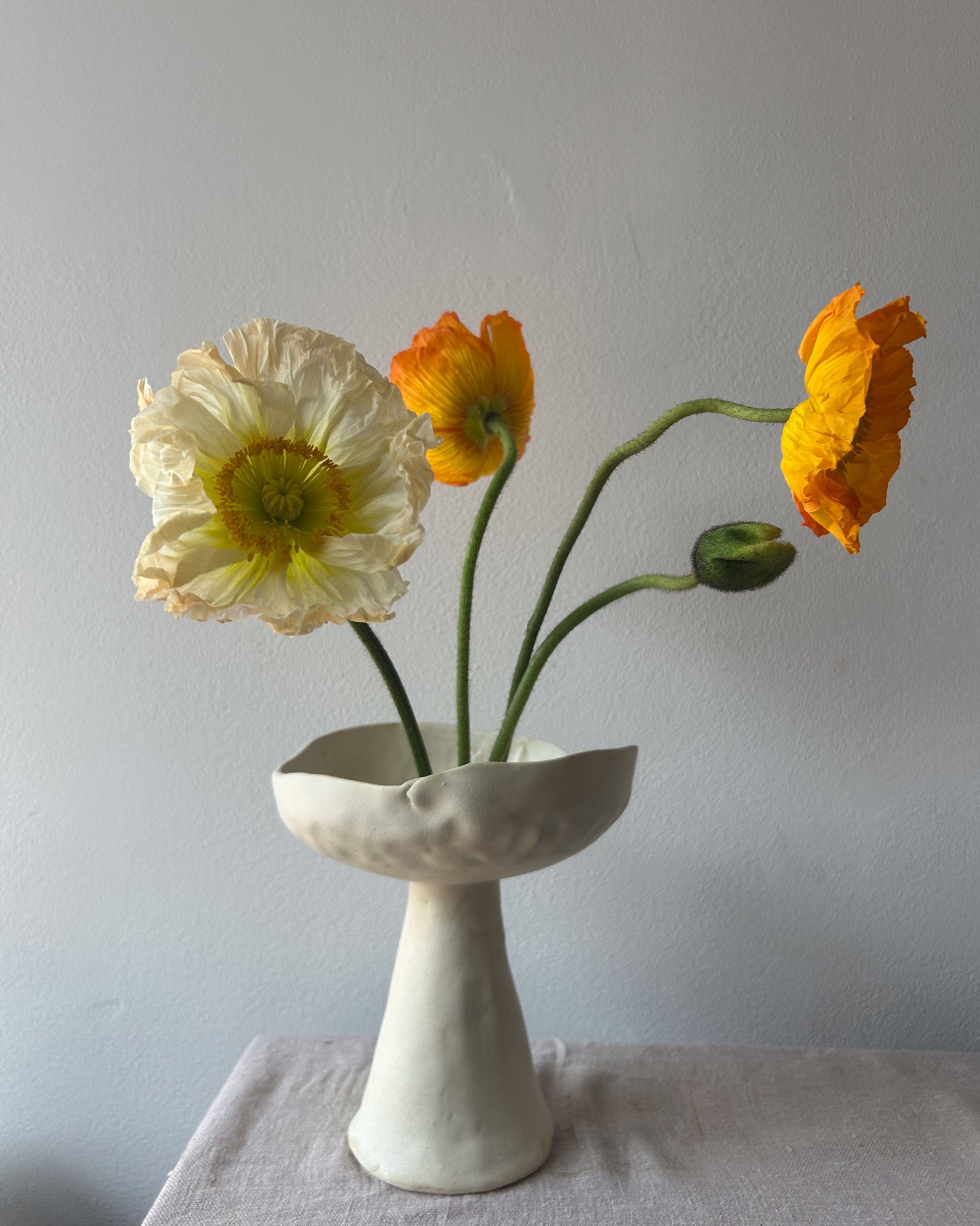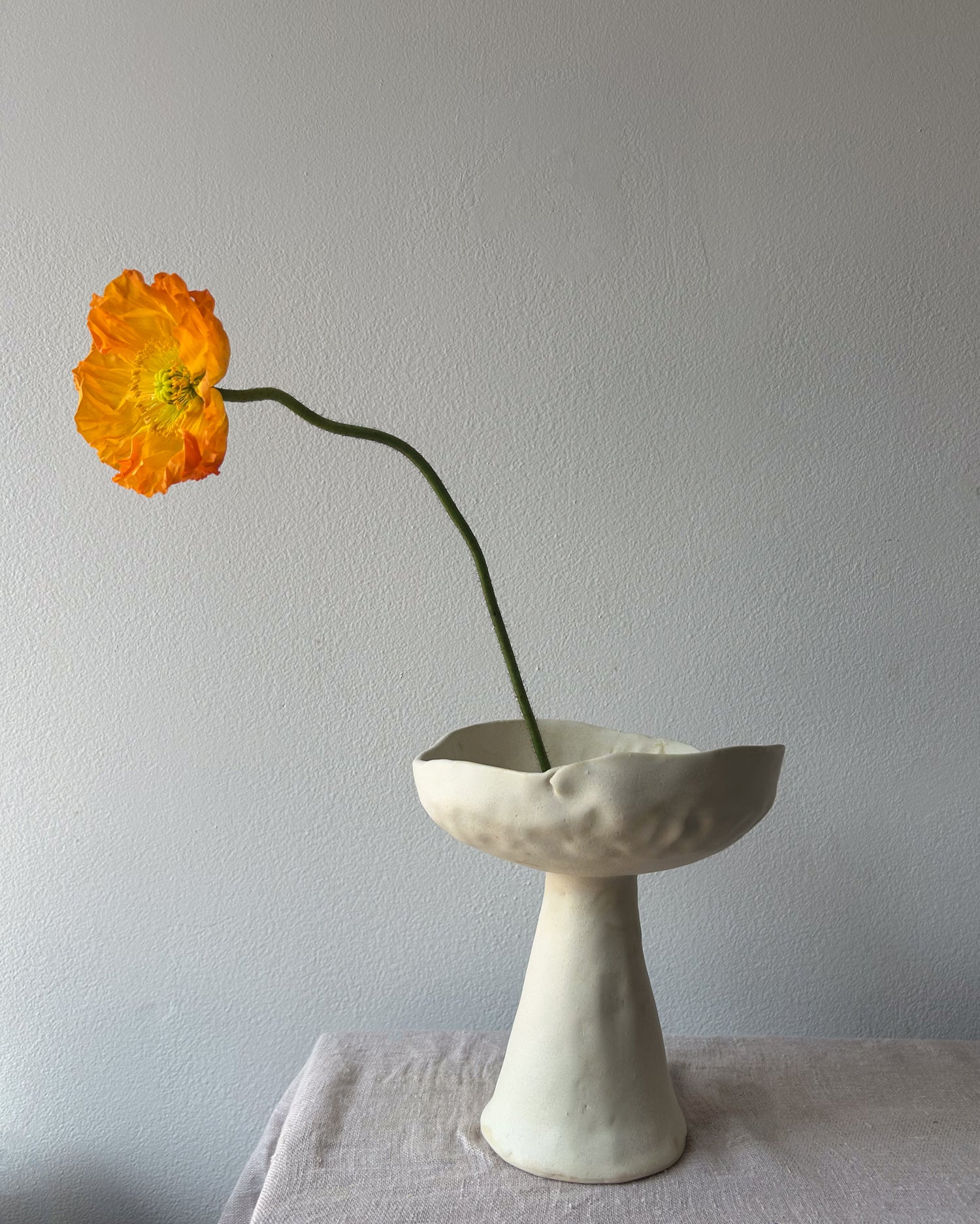 Frosty matte white glaze on porcelain, a small opening holds a few stems or use the bowl  of the vase for a larger arrangement.Handmade in our Brooklyn studio.