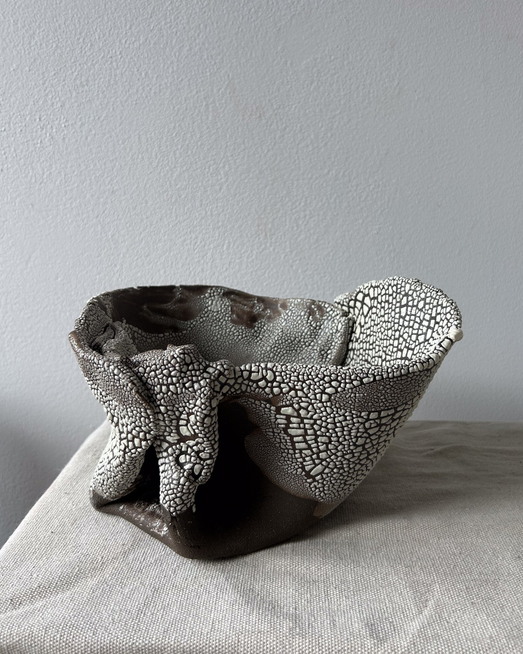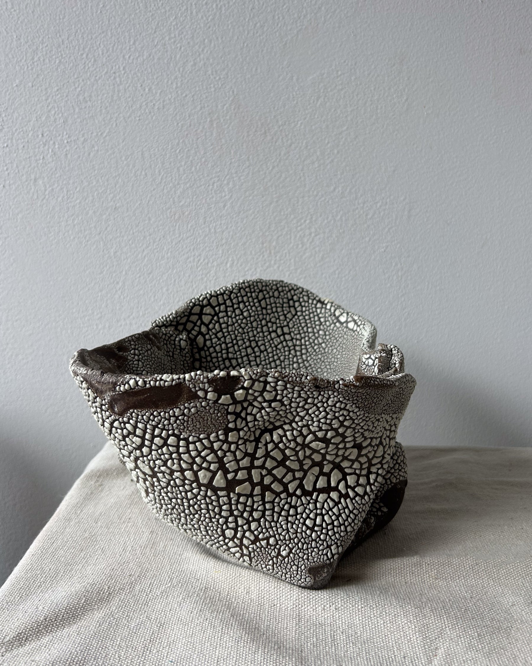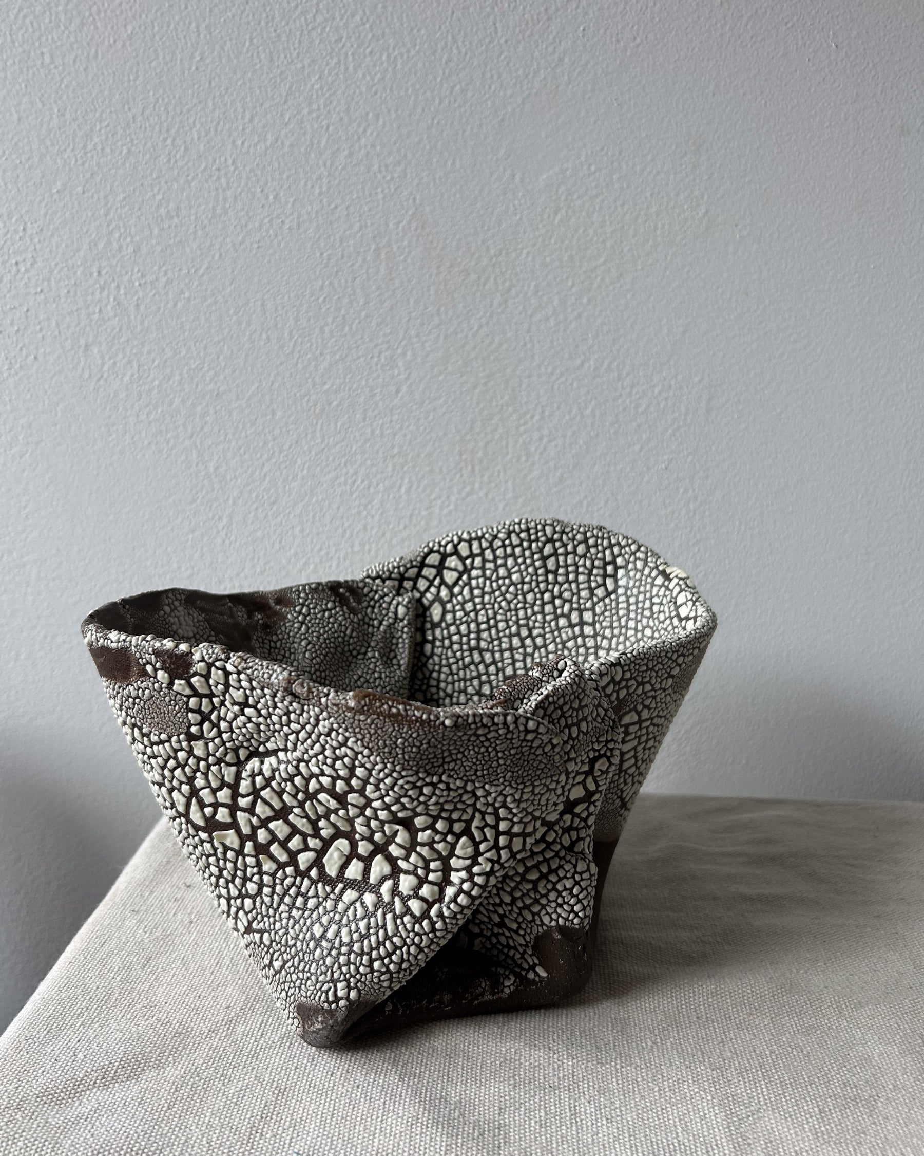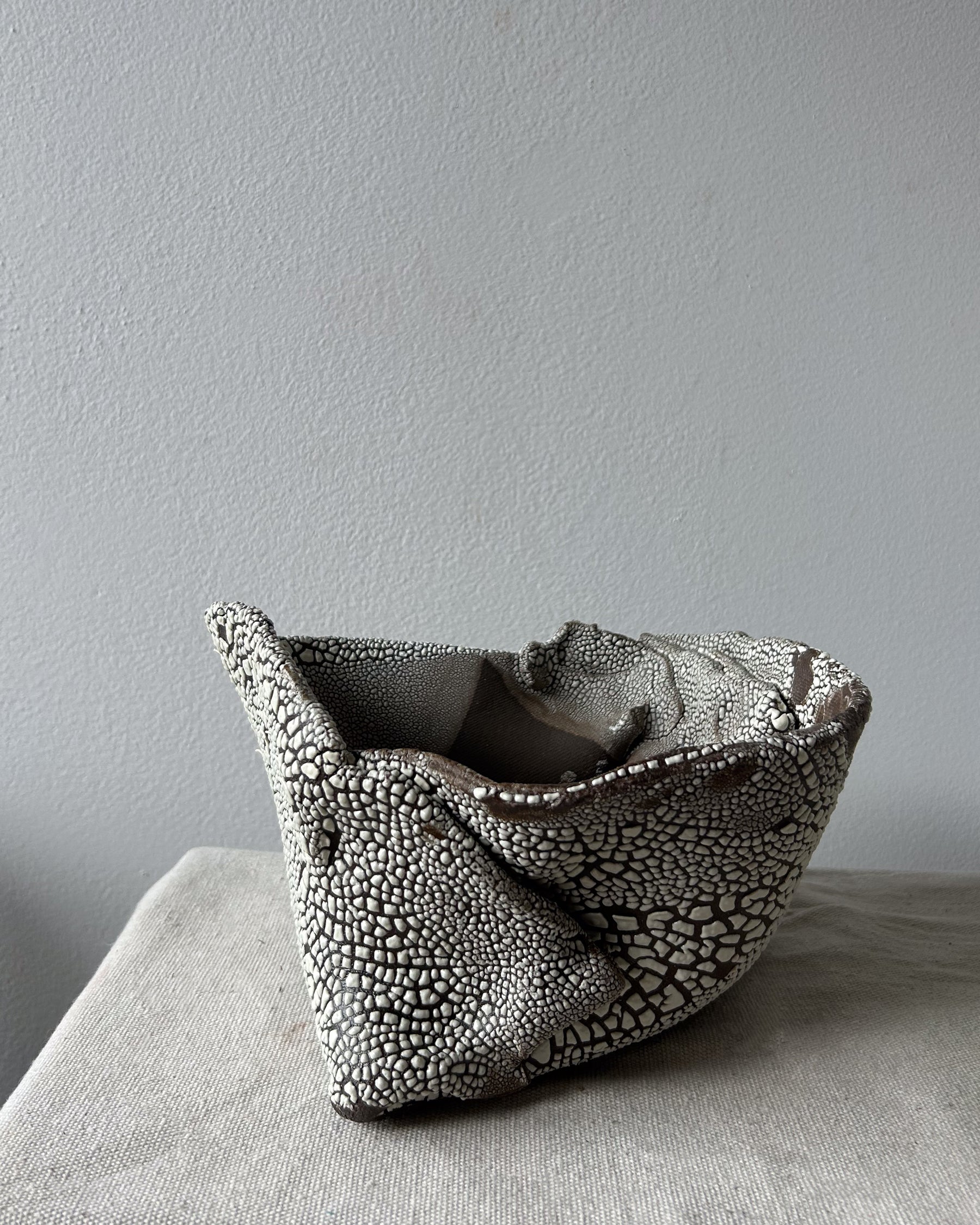 Hand built from a single slab of clay, these planters were folded and pressed into shape and glazed on the exterior with a crawling white glaze on dark brown clay body.