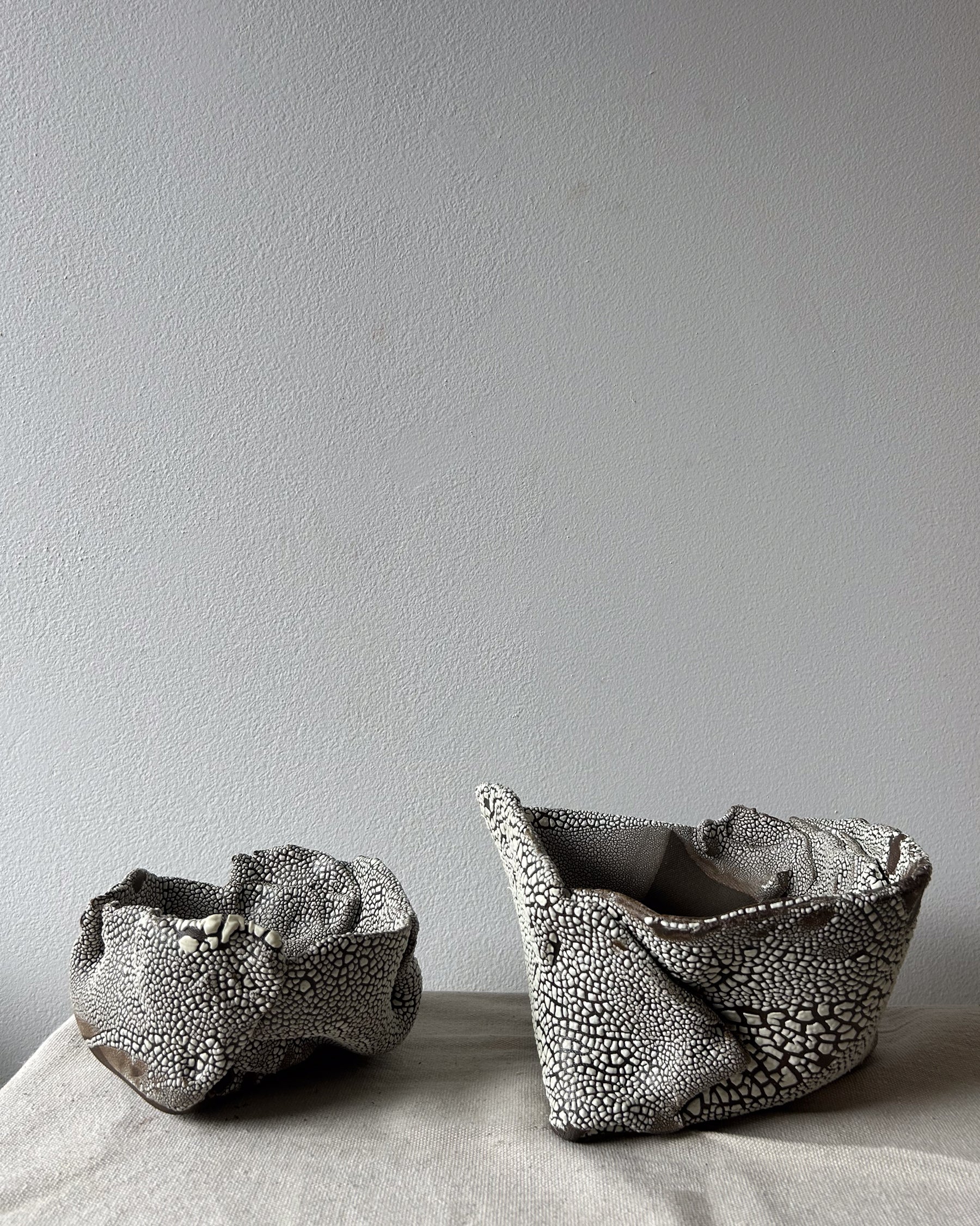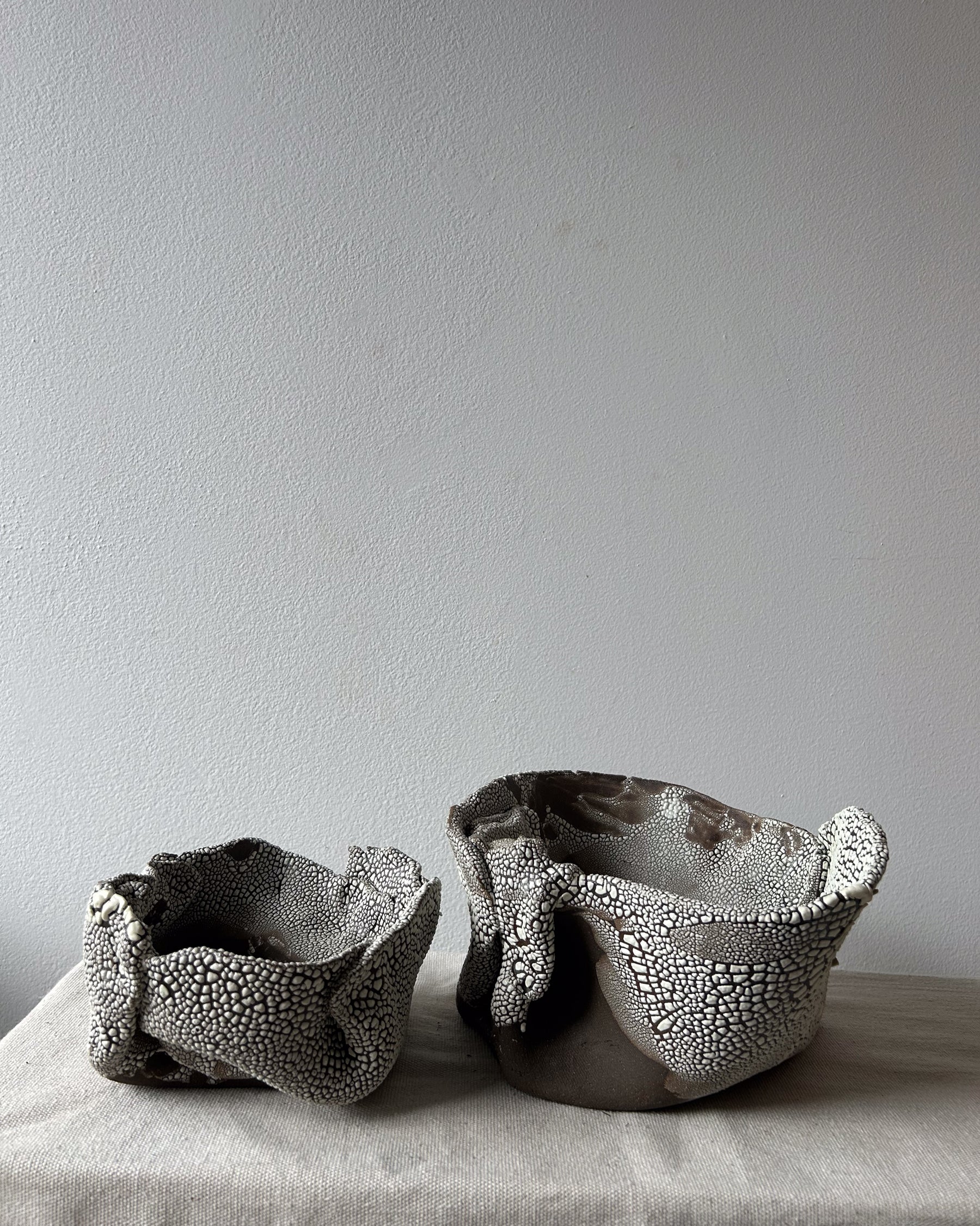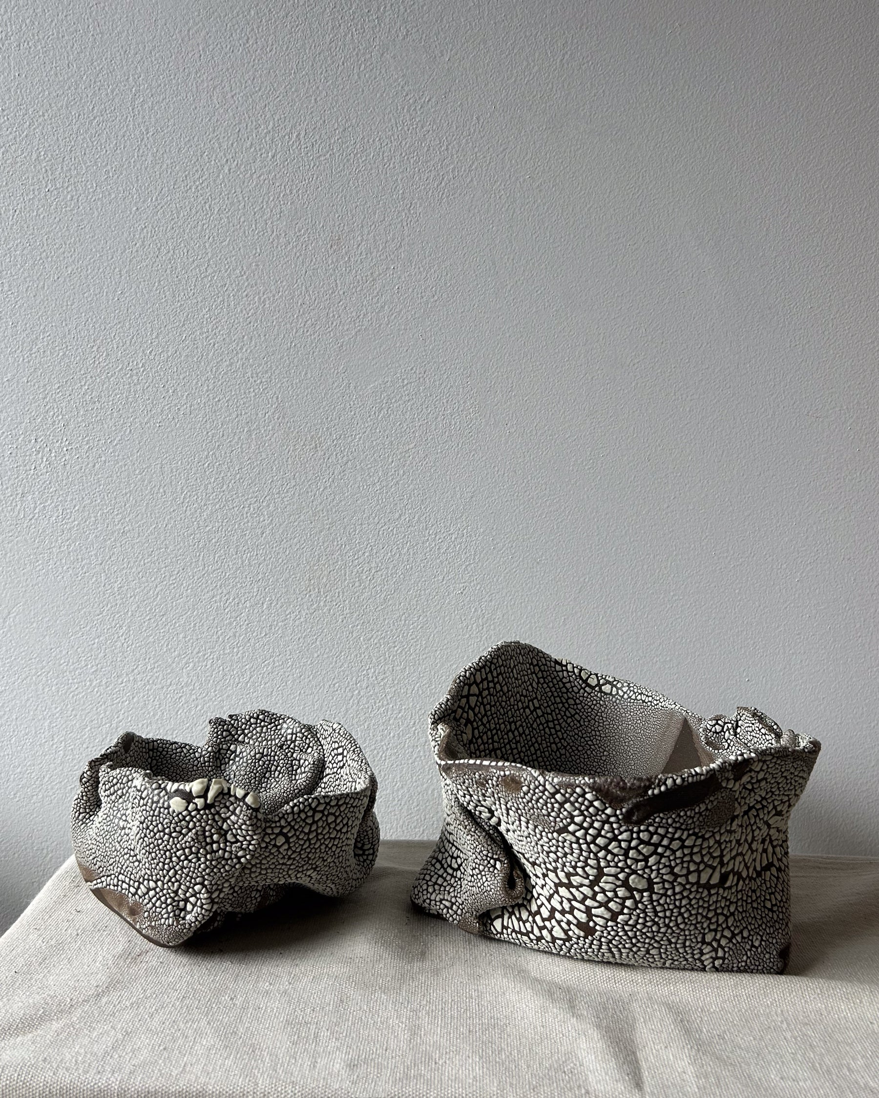 Hand built from a single slab of clay, these planters were folded and pressed into shape and glazed on the exterior with a crawling white glaze on dark brown clay body.