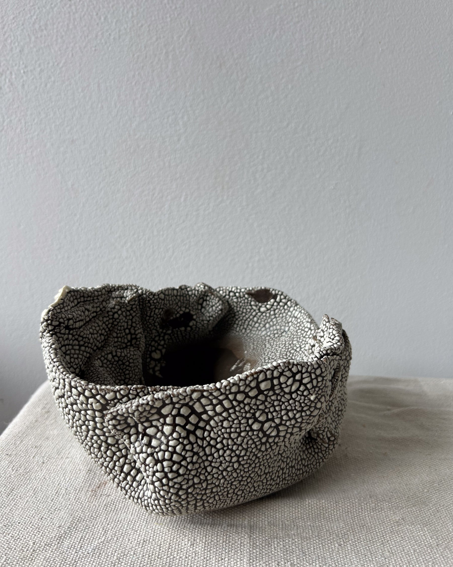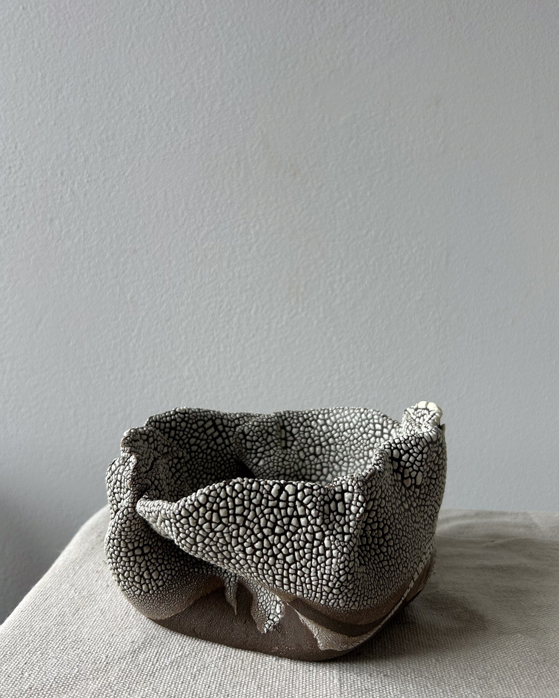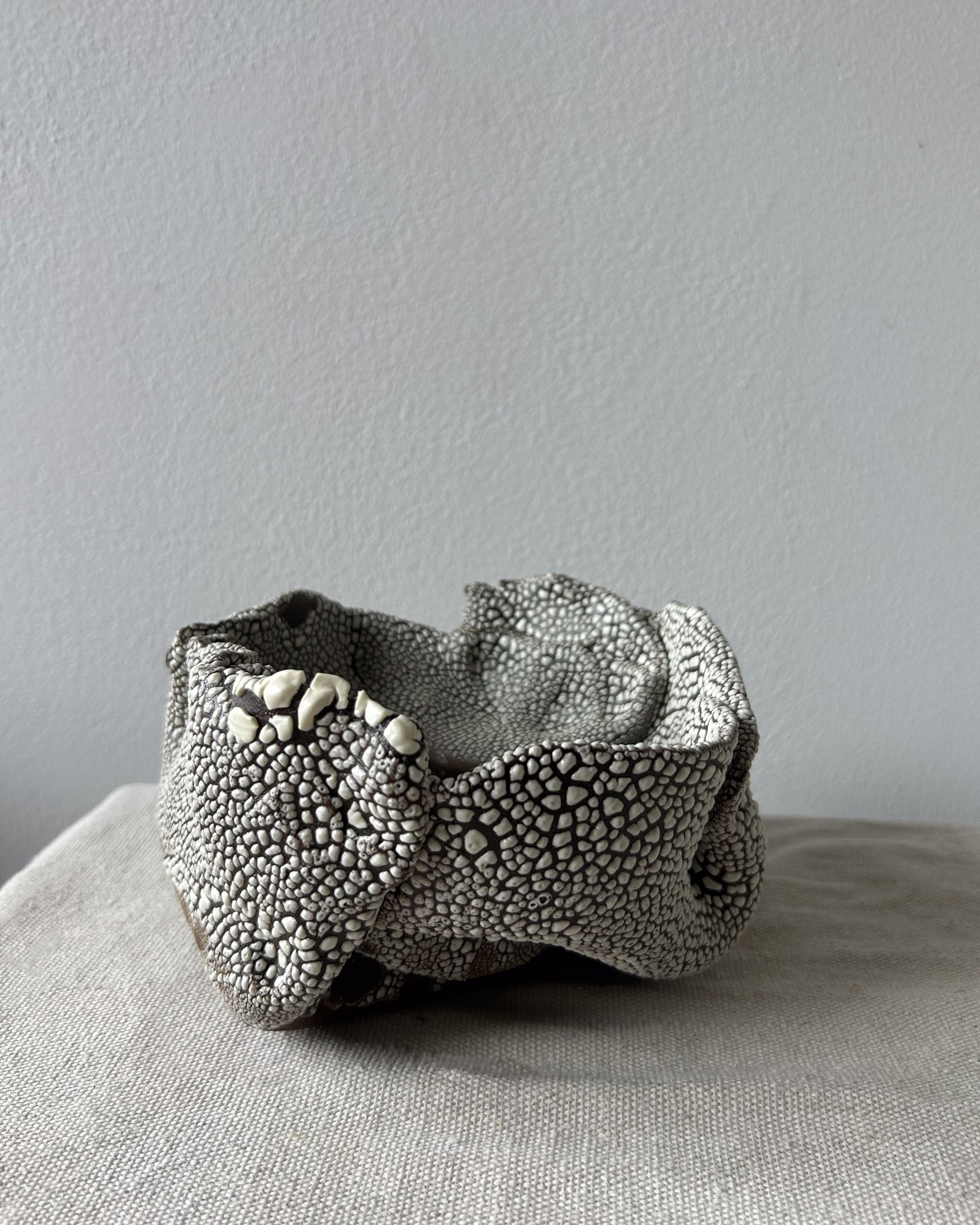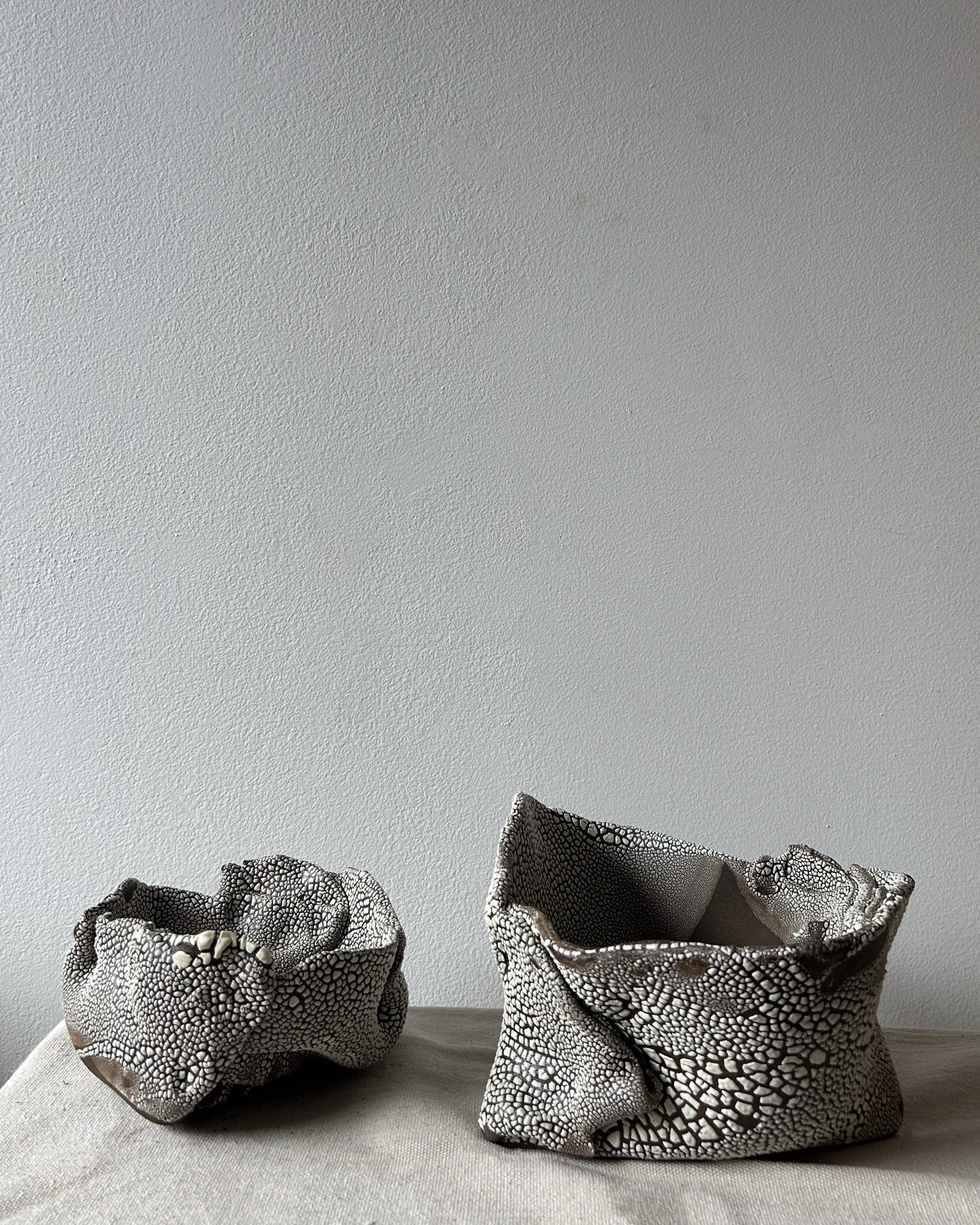 Hand built from a single slab of clay, these planters were folded and pressed into shape and glazed on the exterior with a crawling white glaze on dark brown clay body.