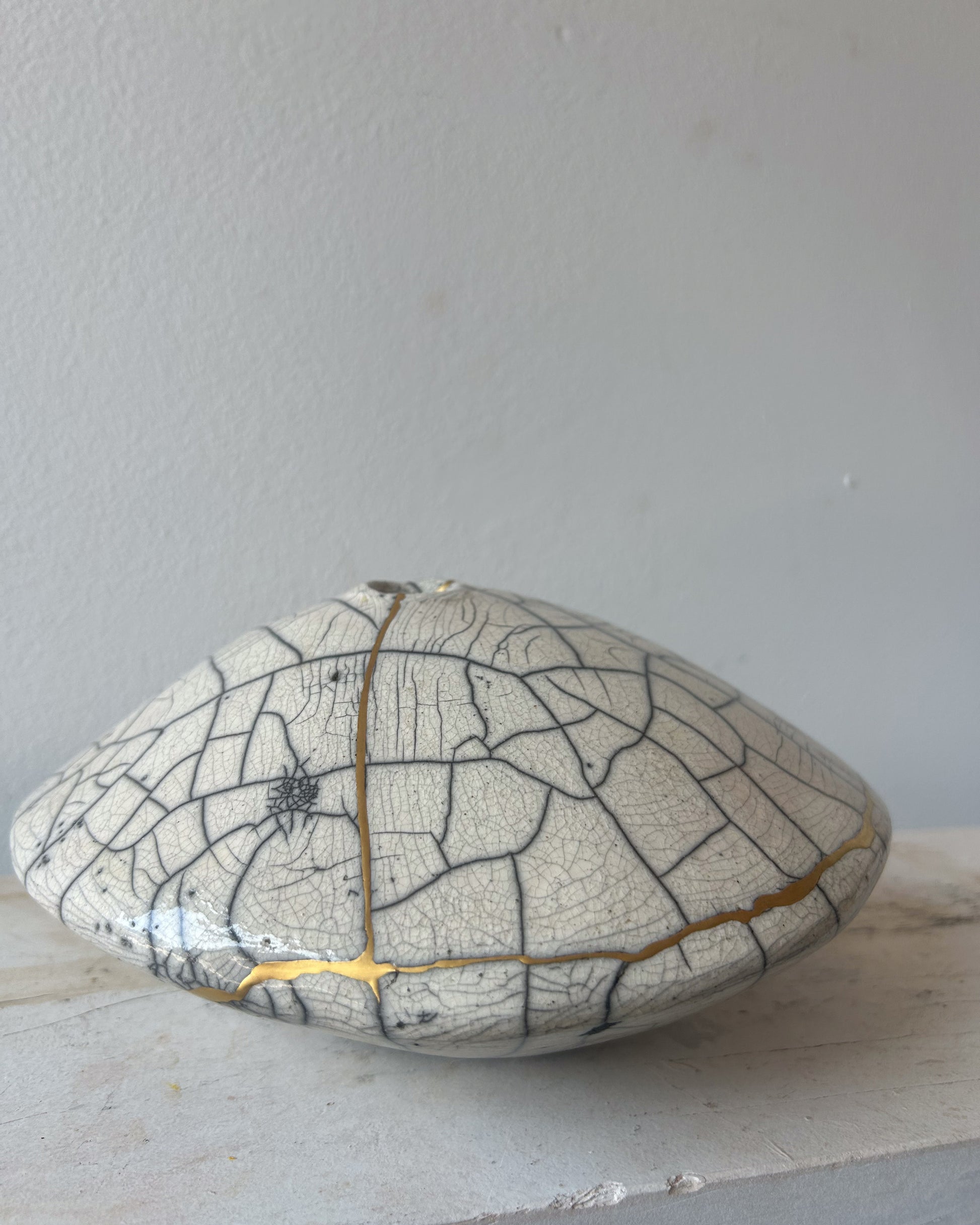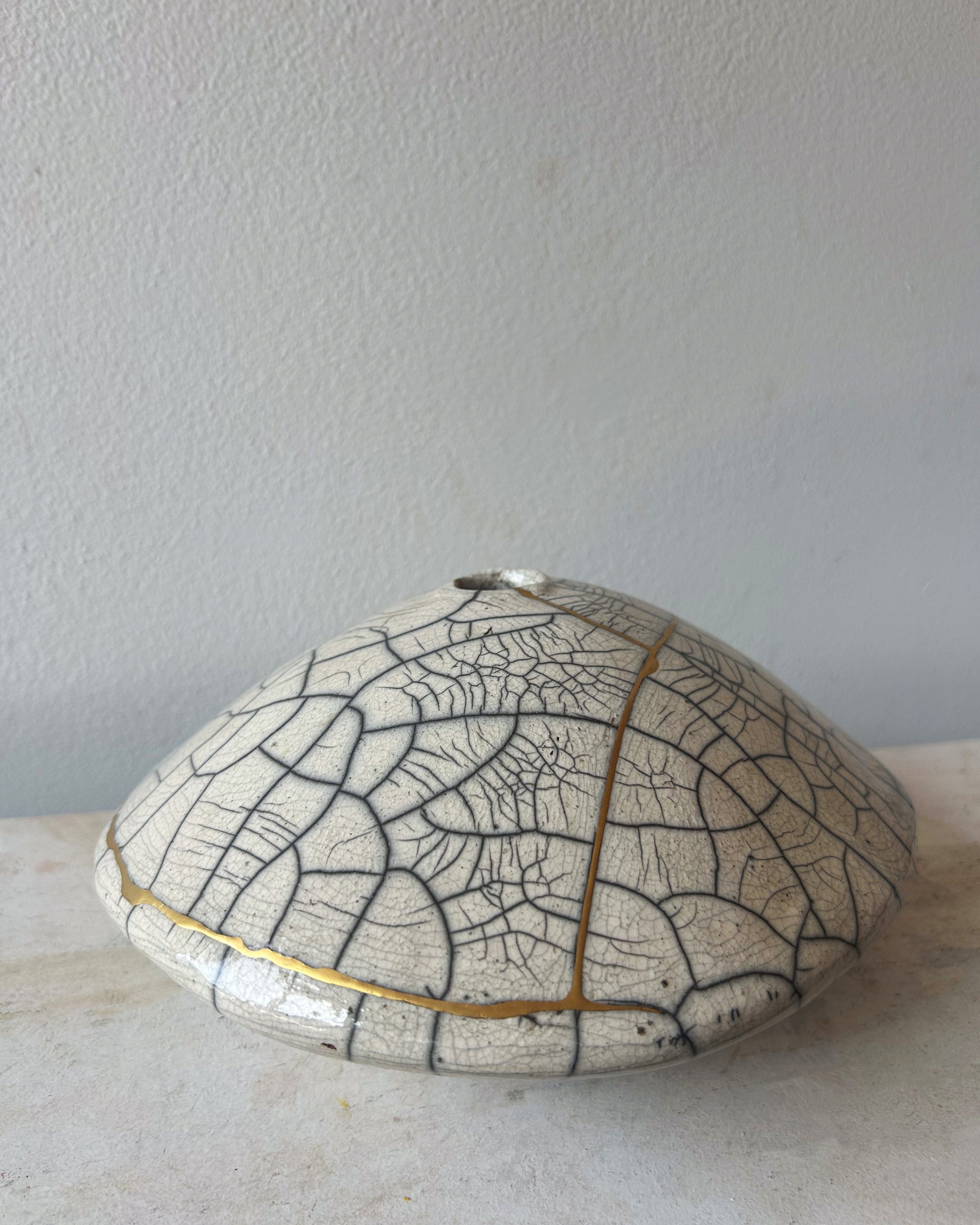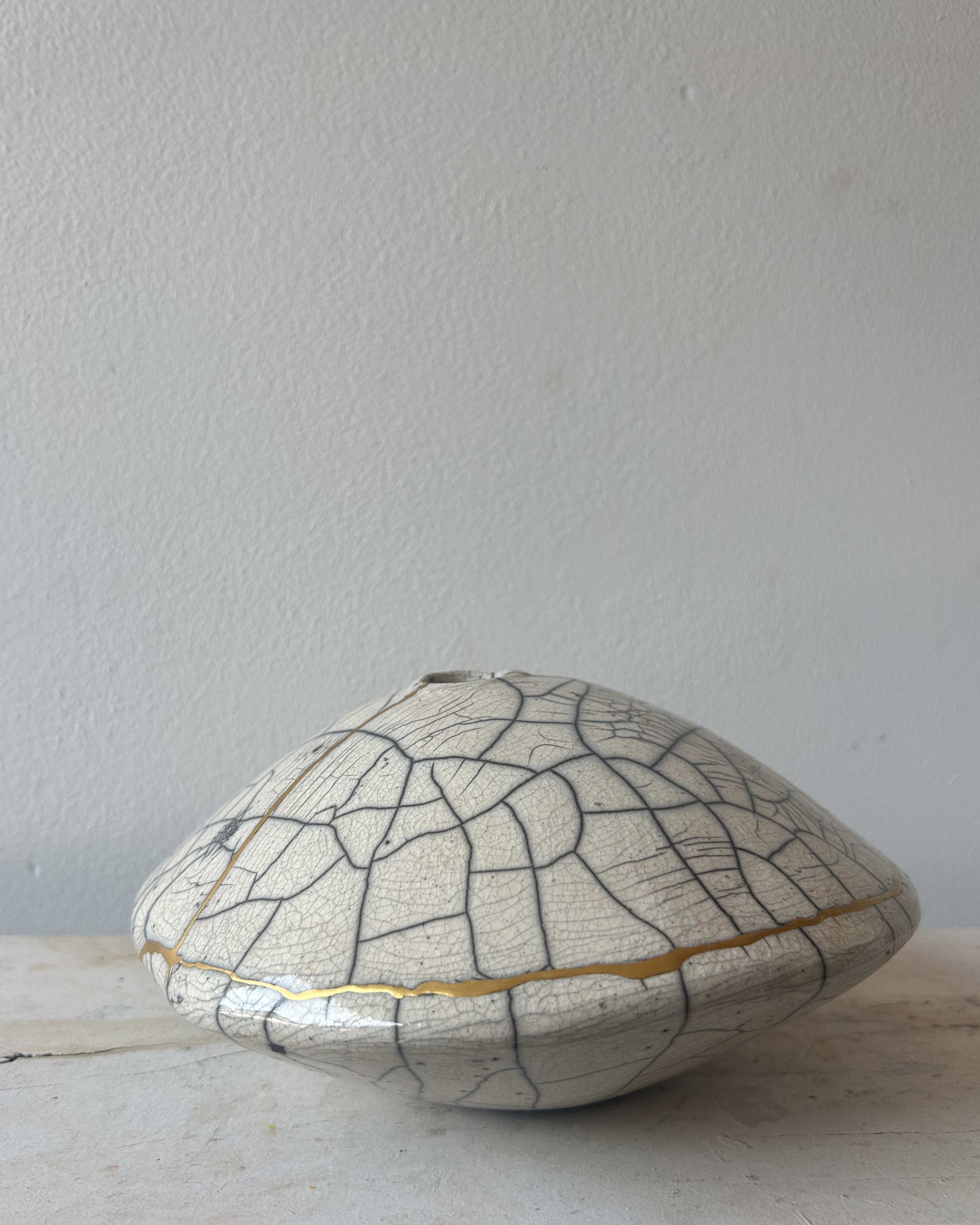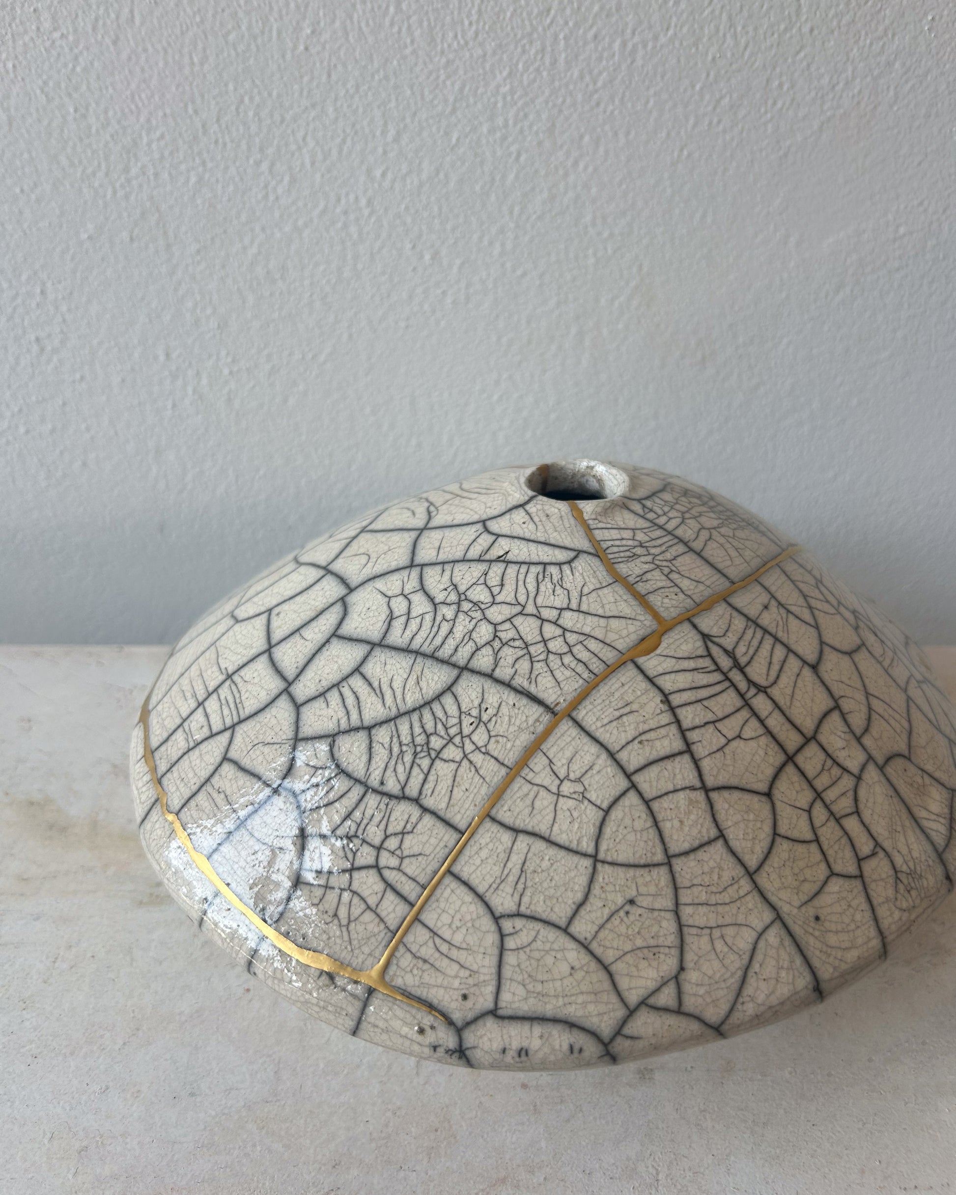 Low stoneware vase, hand-built in our Brooklyn Studio, then Raku-fired in a New Jersey back yard, and repaired with 24k gold kintsugi by artist Yuko Gungi.