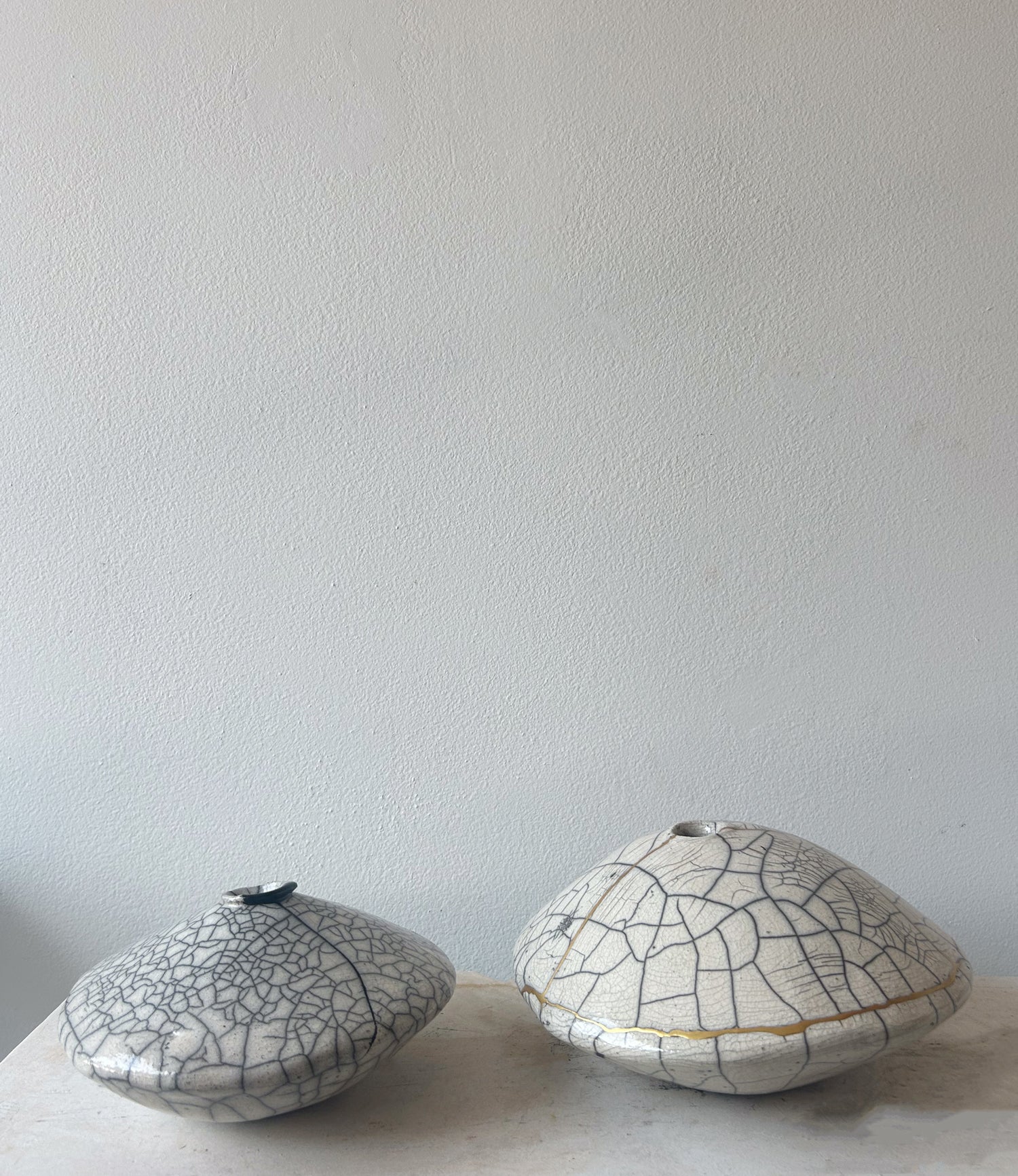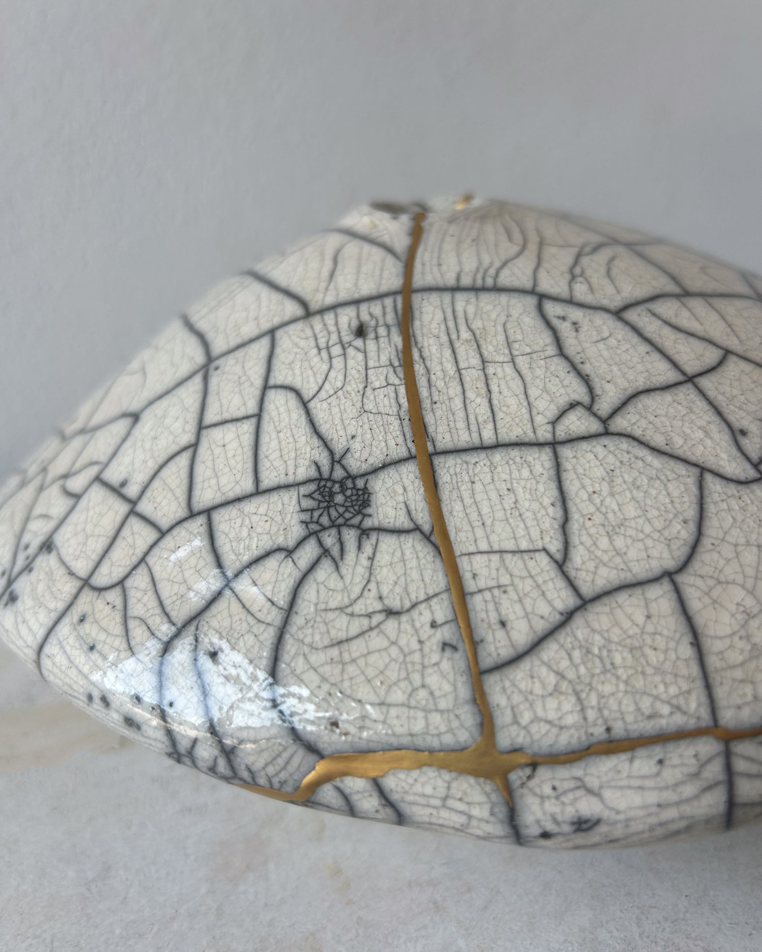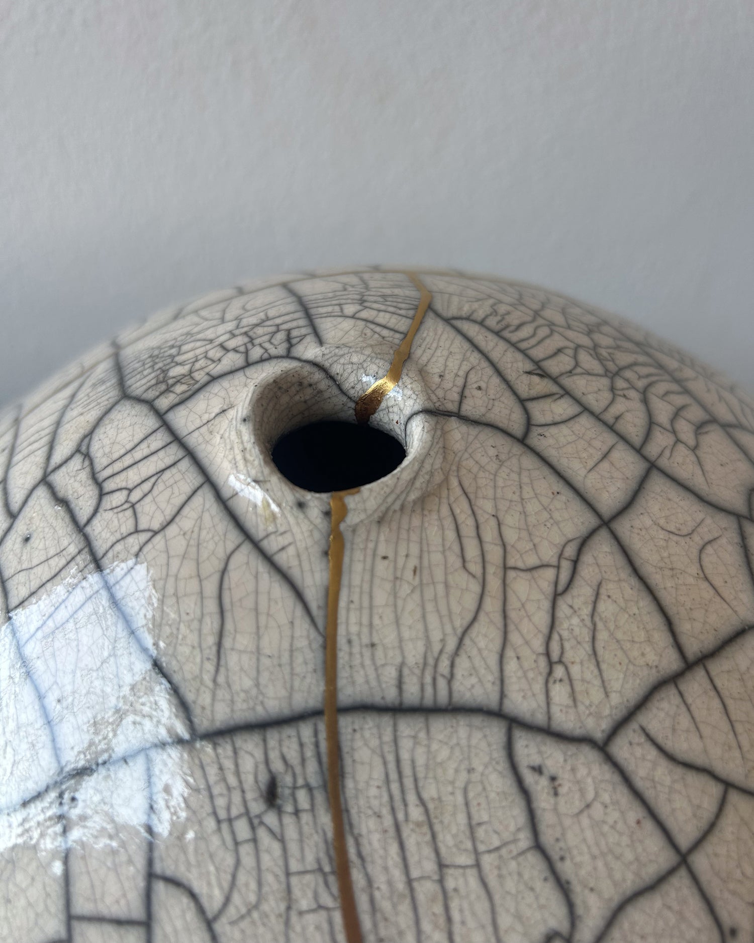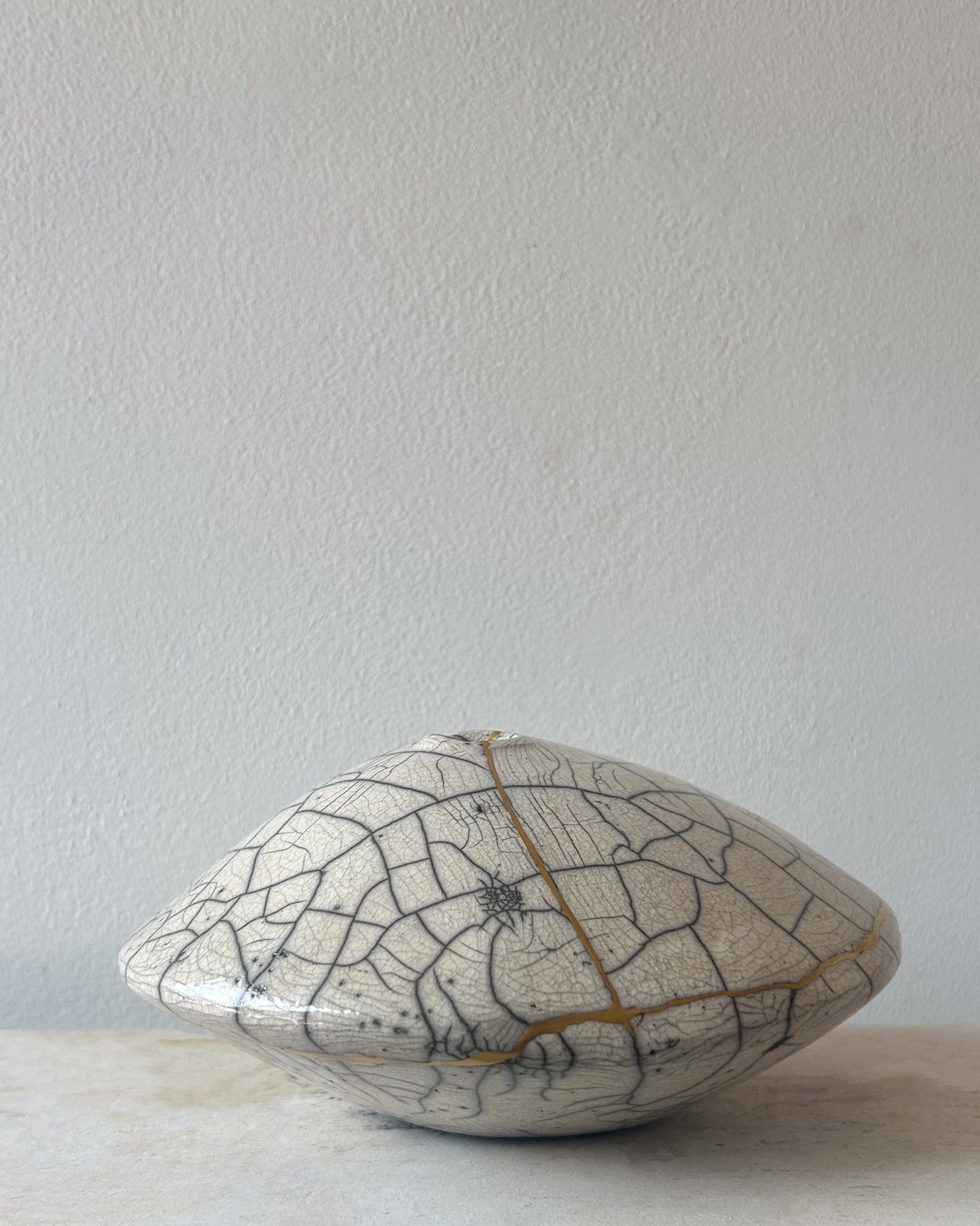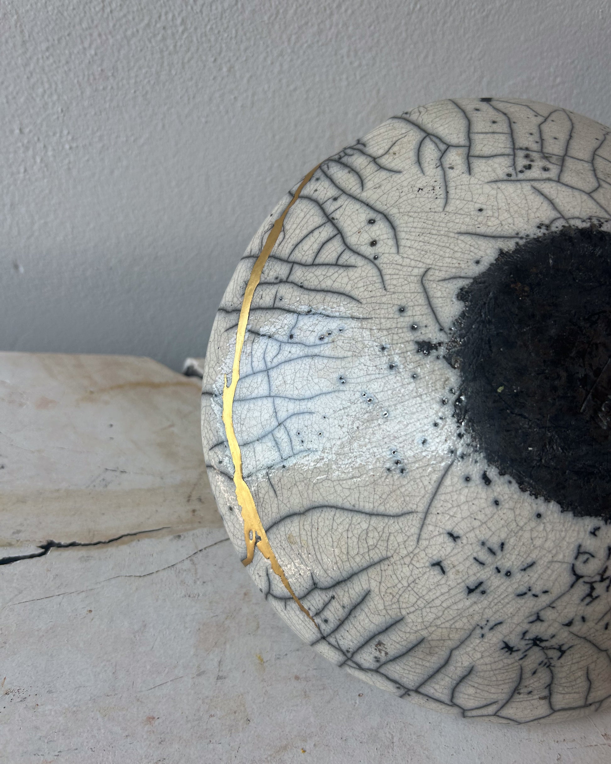 Low stoneware vase, hand-built in our Brooklyn Studio, then Raku-fired in a New Jersey back yard, and repaired with 24k gold kintsugi by artist Yuko Gungi.