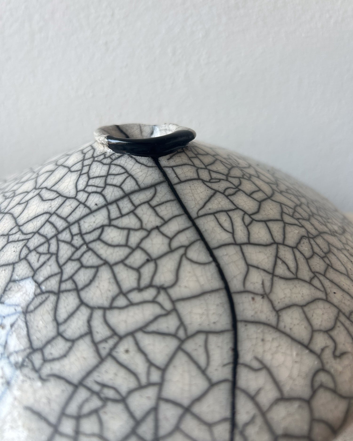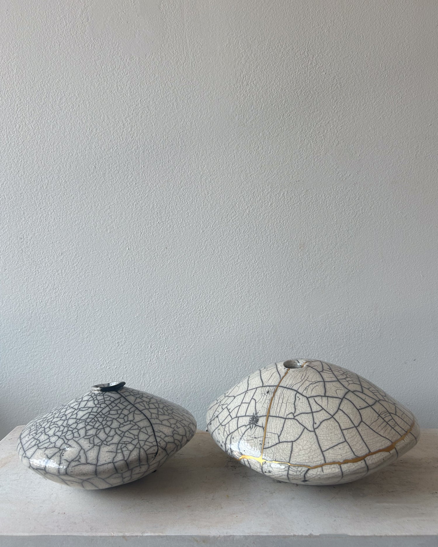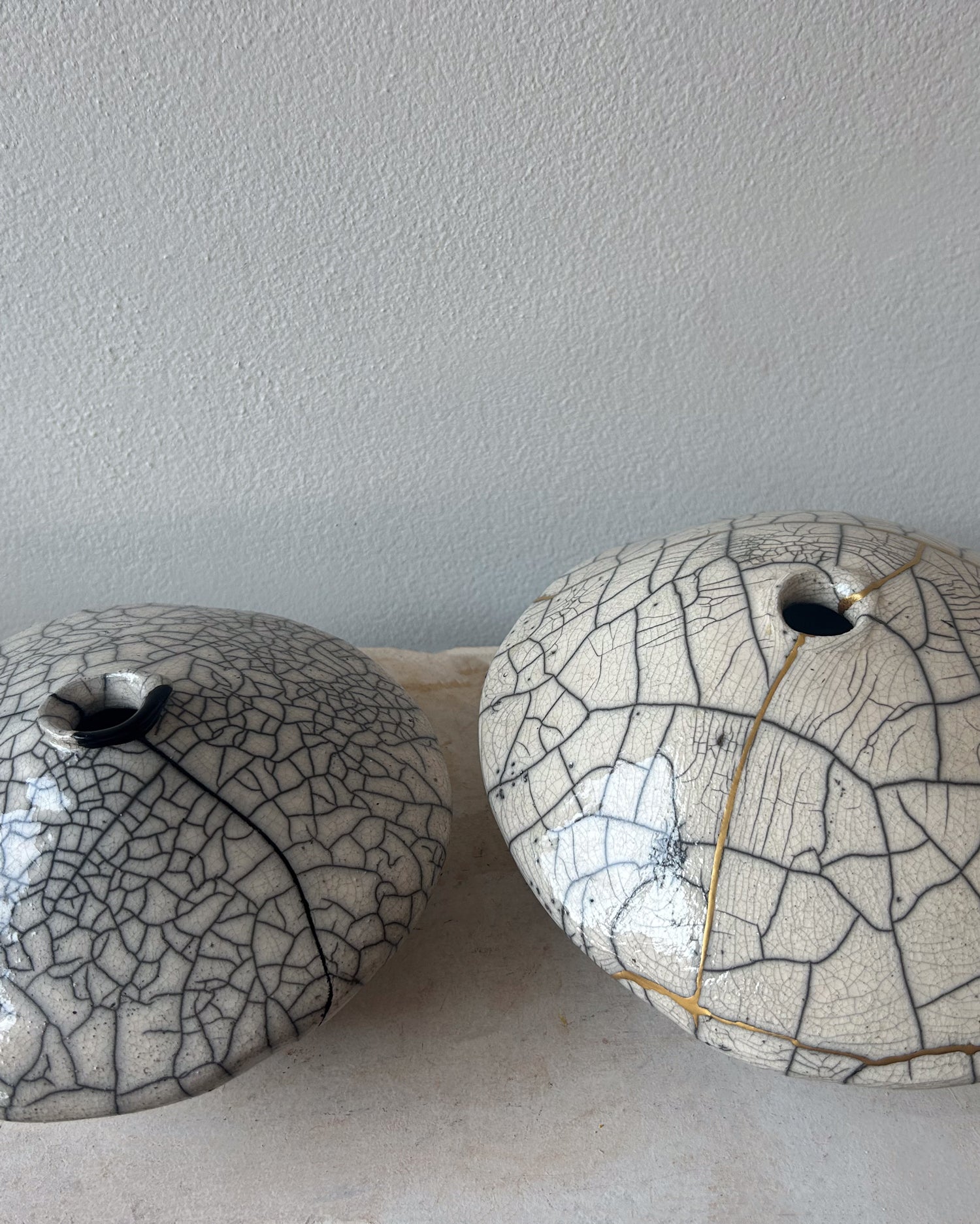 Low stoneware vase, hand-built in our Brooklyn Studio, then Raku-fired in a New Jersey back yard, and repaired with black lacquer kintsugi by artist Yuko Gungi.