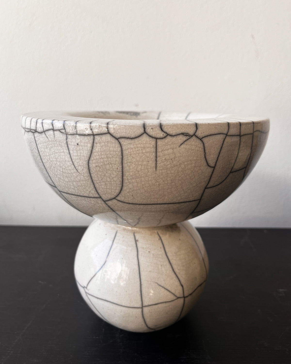 Hollow decorative bowl with ball base, formed from stoneware slabs and Raku-fired with a clear crackle glaze.