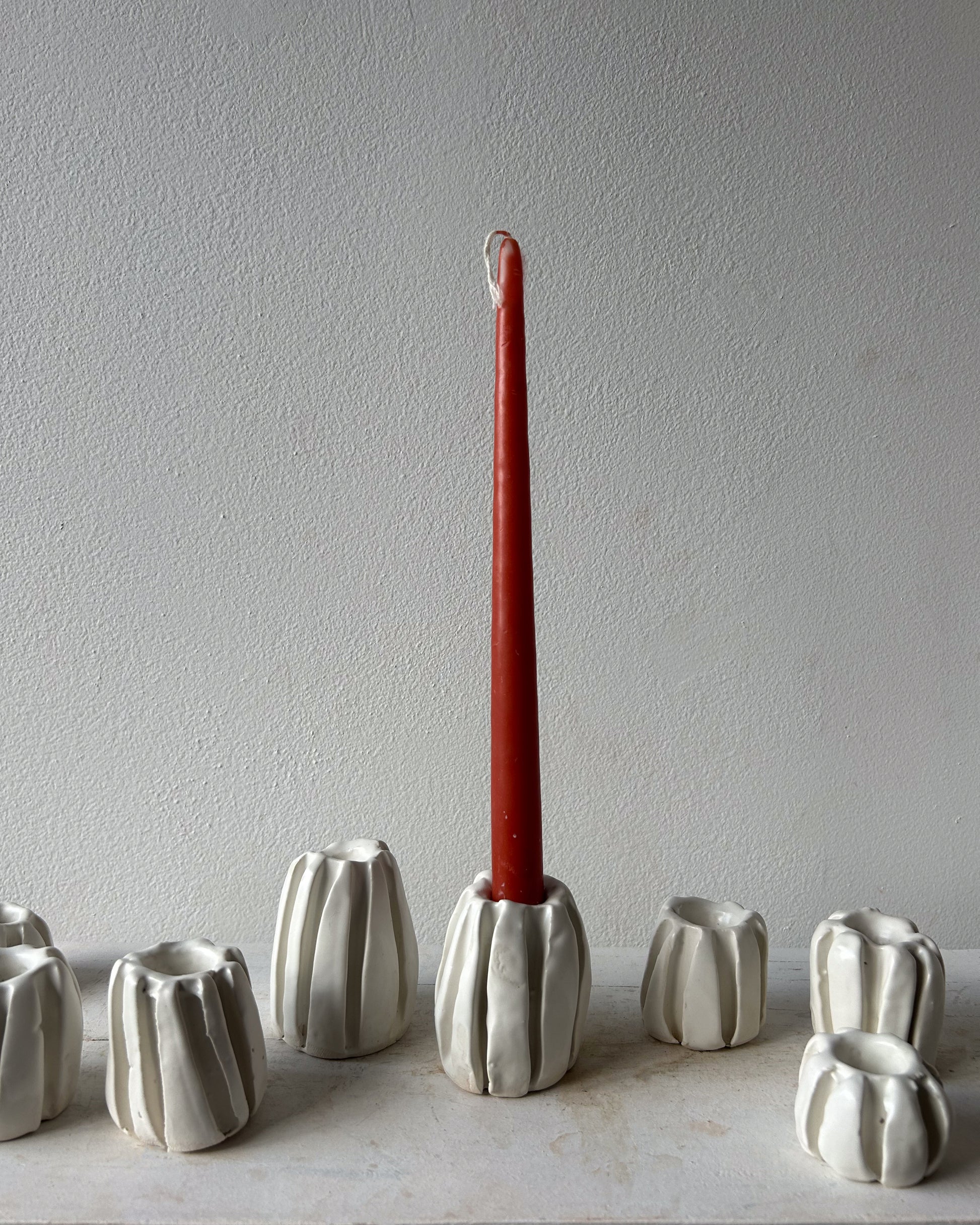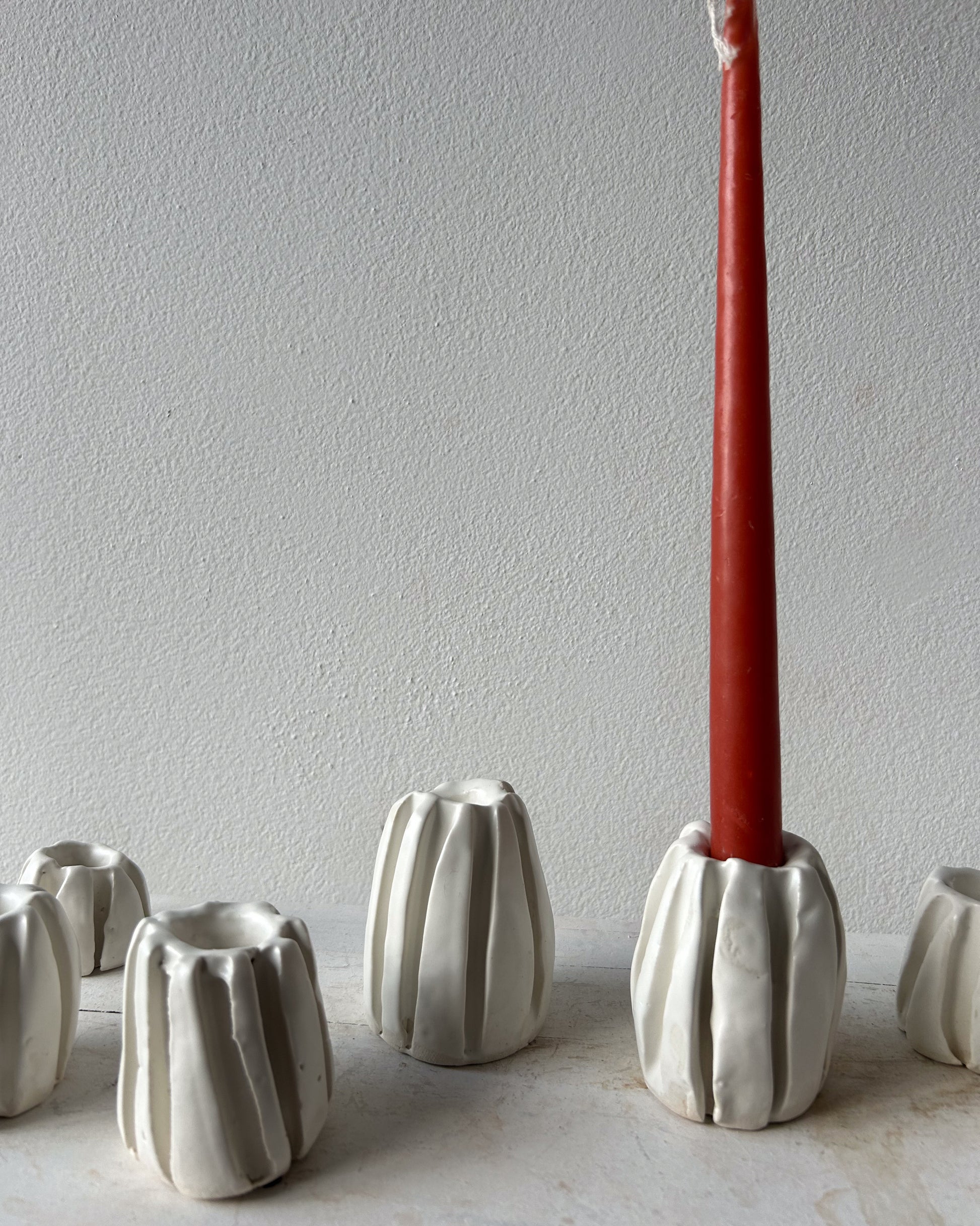 Chunky ribbed candleholders with matte white glaze on porcelain.