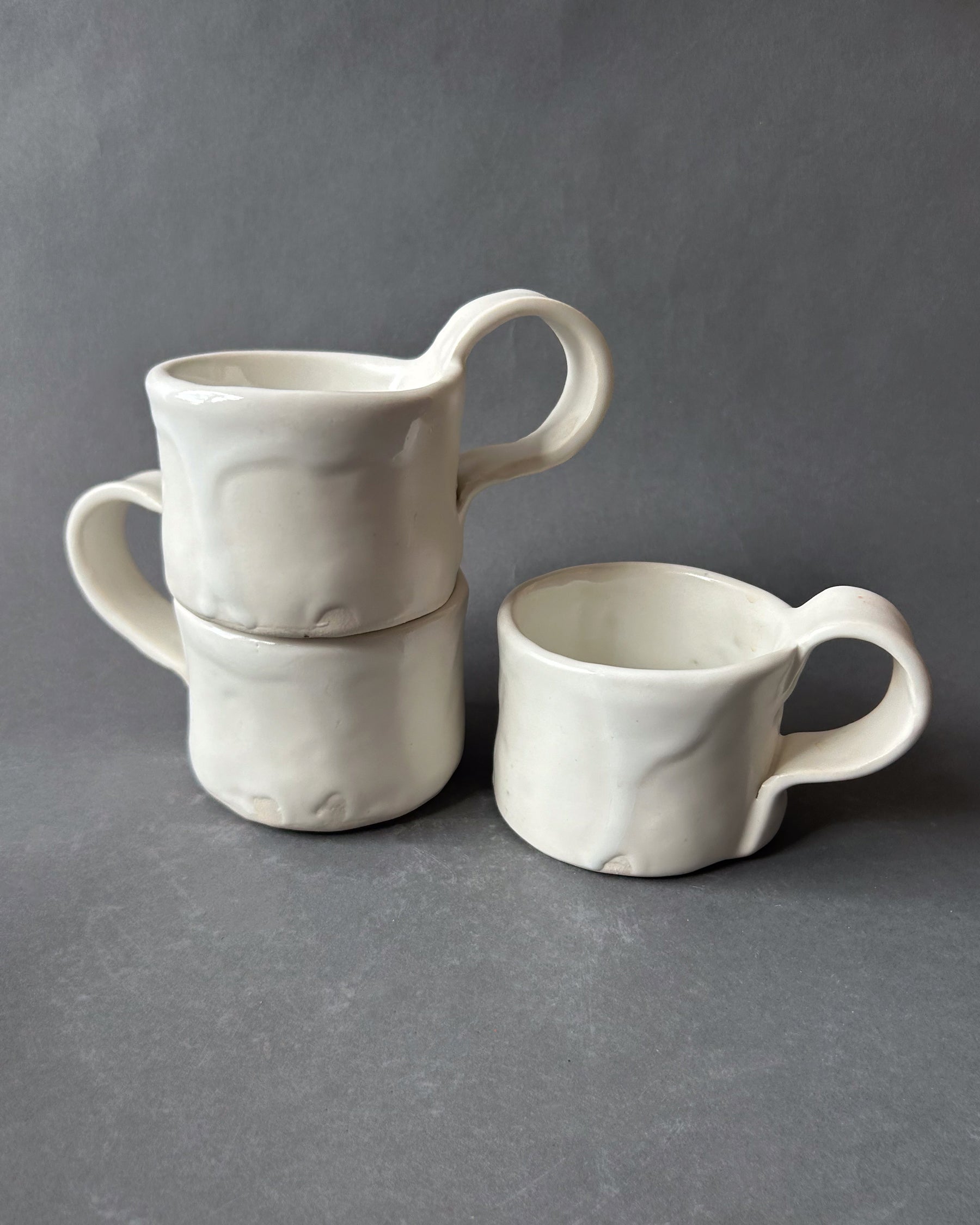 Slab-formed porcelain mugs with layers of glossy and matte white glaze. No two are exactly alike.