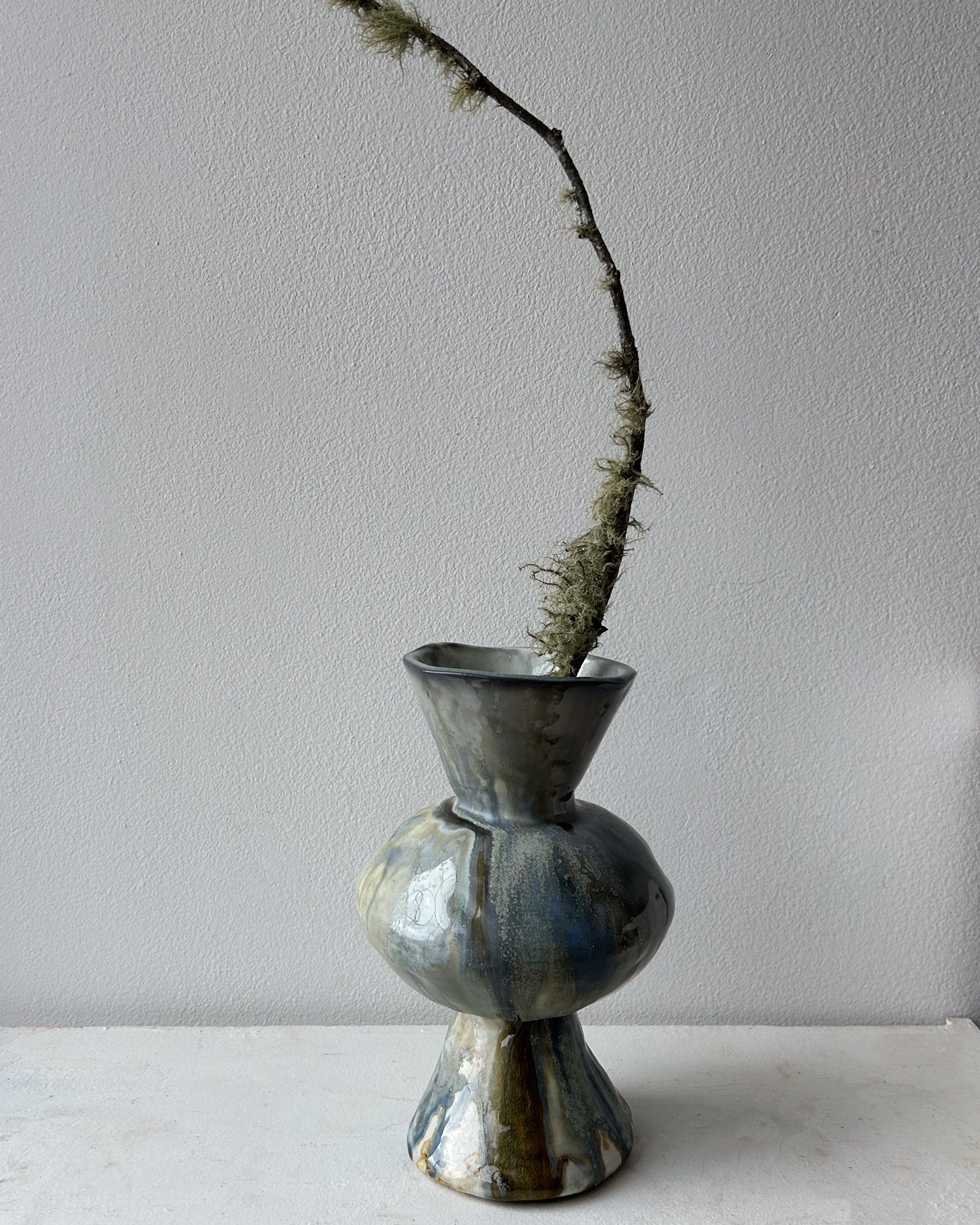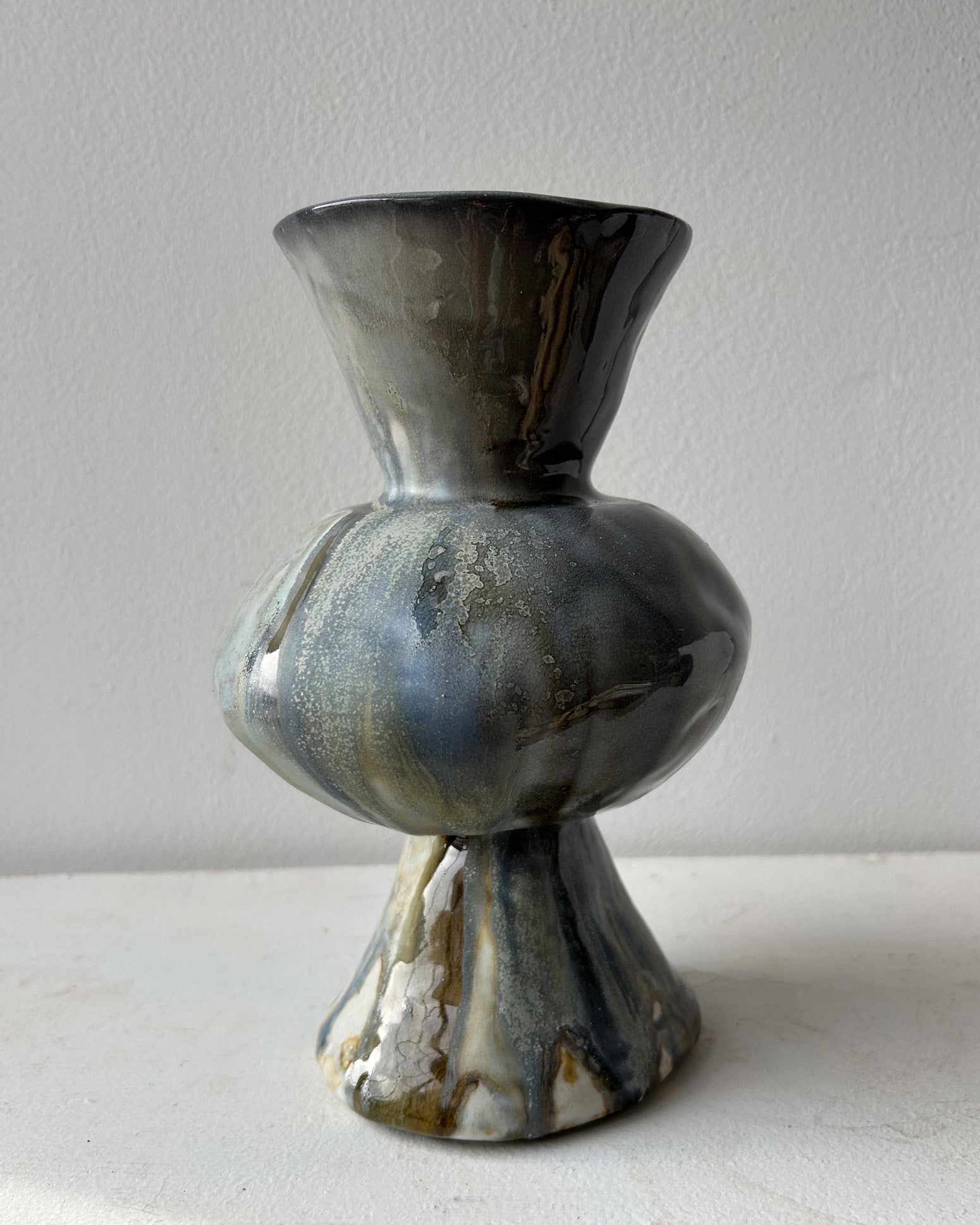 Porcelain vase with drippy glossy and matte blue, gray, green and coral glaze effects.