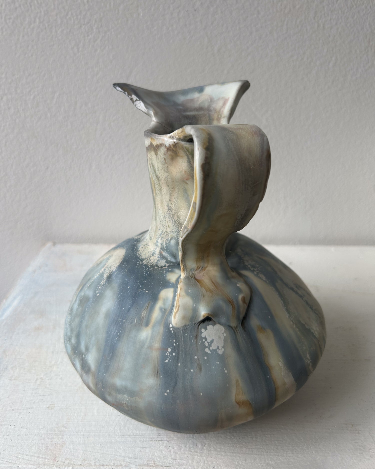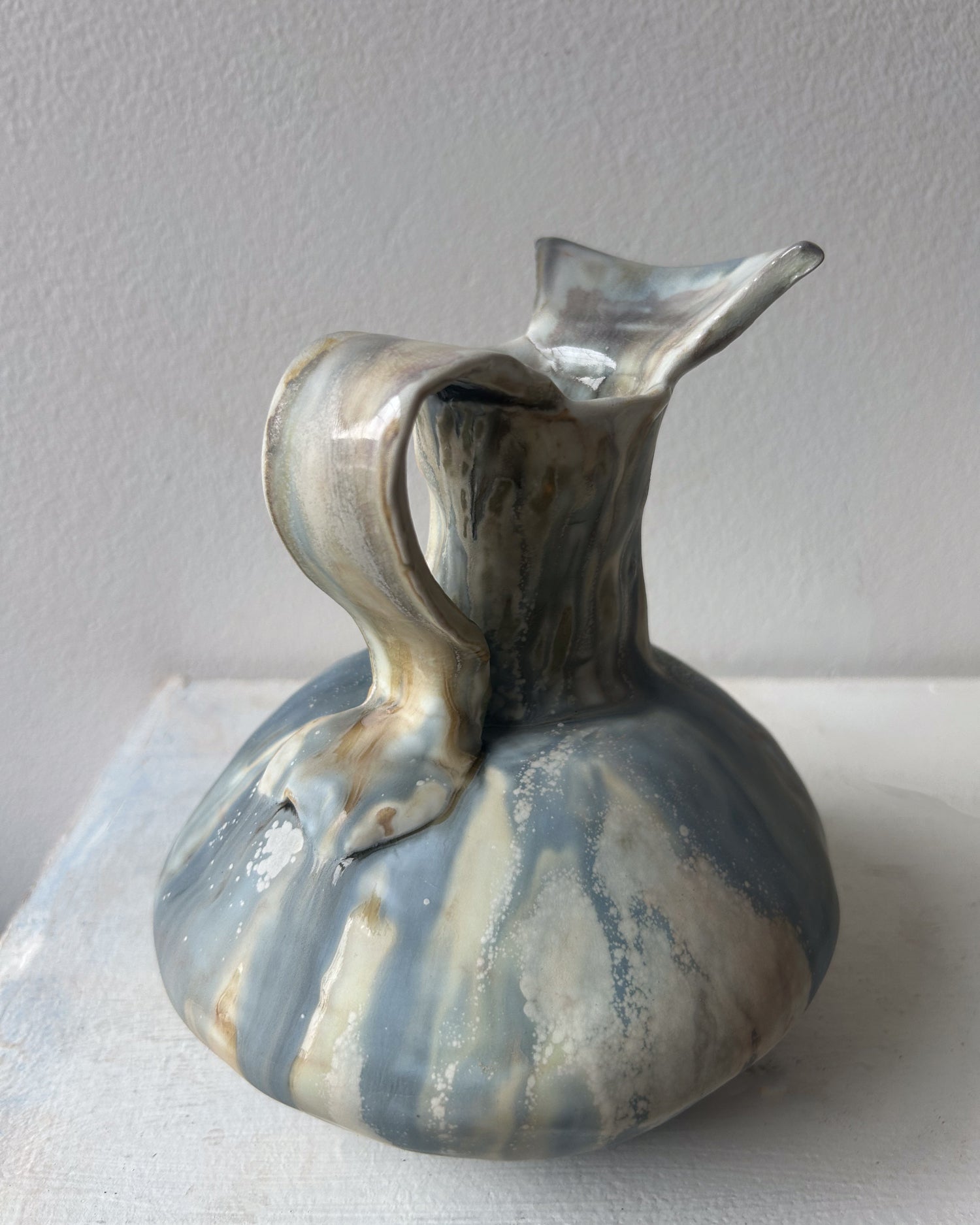 Soda-fired Porcelain Vase with handle and spout. Blue, gray, and gold with crystallization.