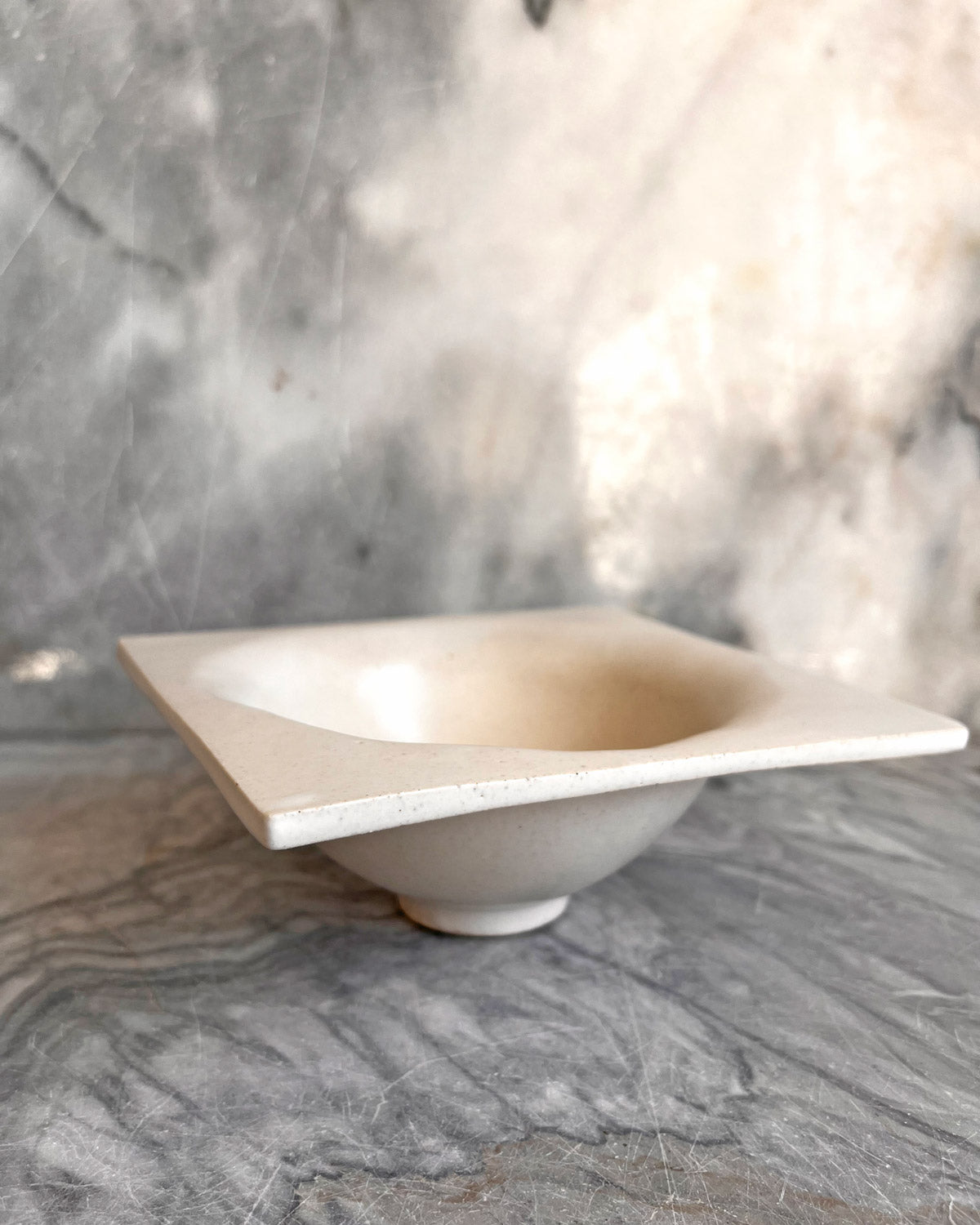 Small bowl with square rim and small foot. Hand-built from stoneware slabs. Matte white glaze.