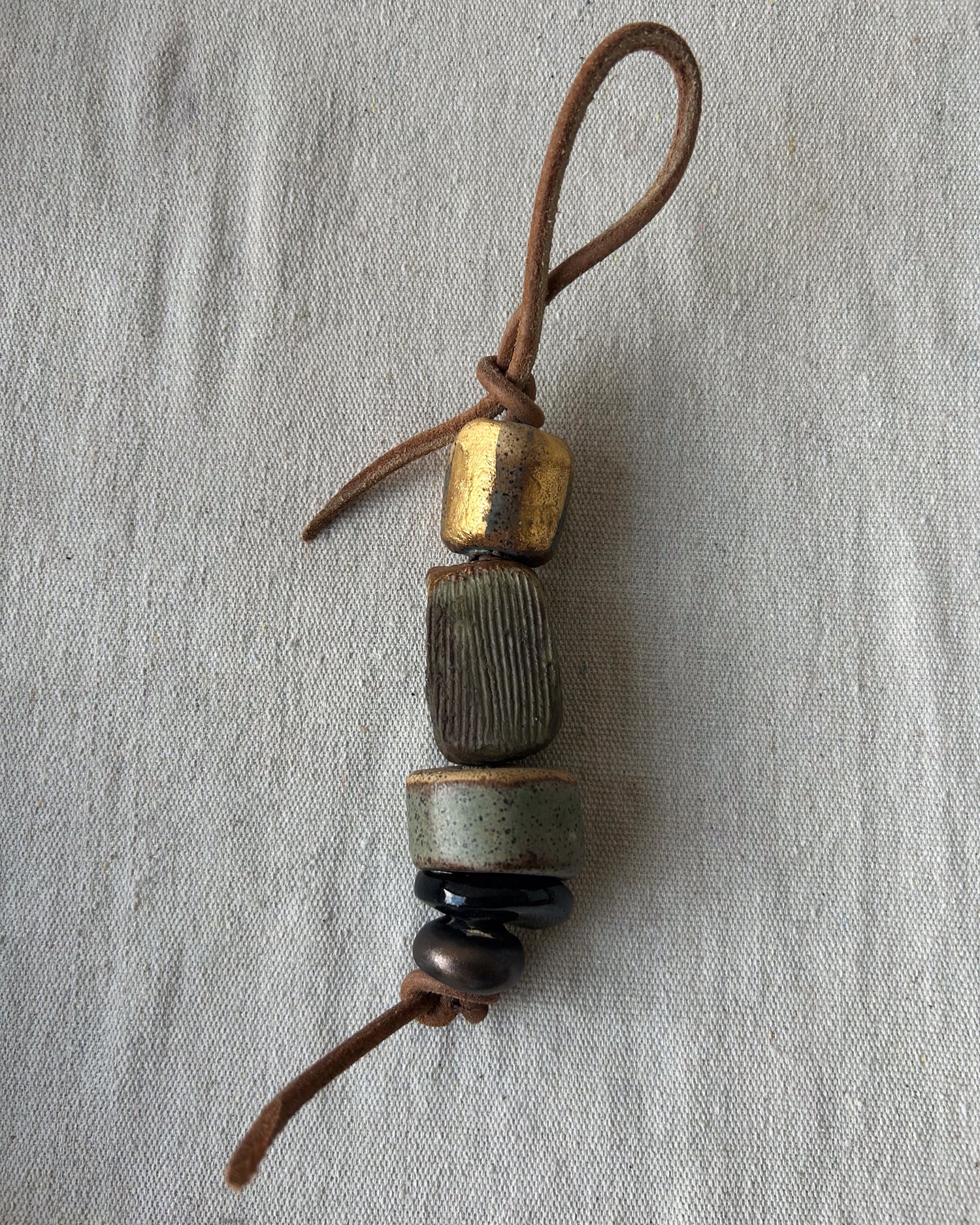 Handcrafted ceramic beads with 24 karat gold luster overglaze. Hand assembled with leather cord.