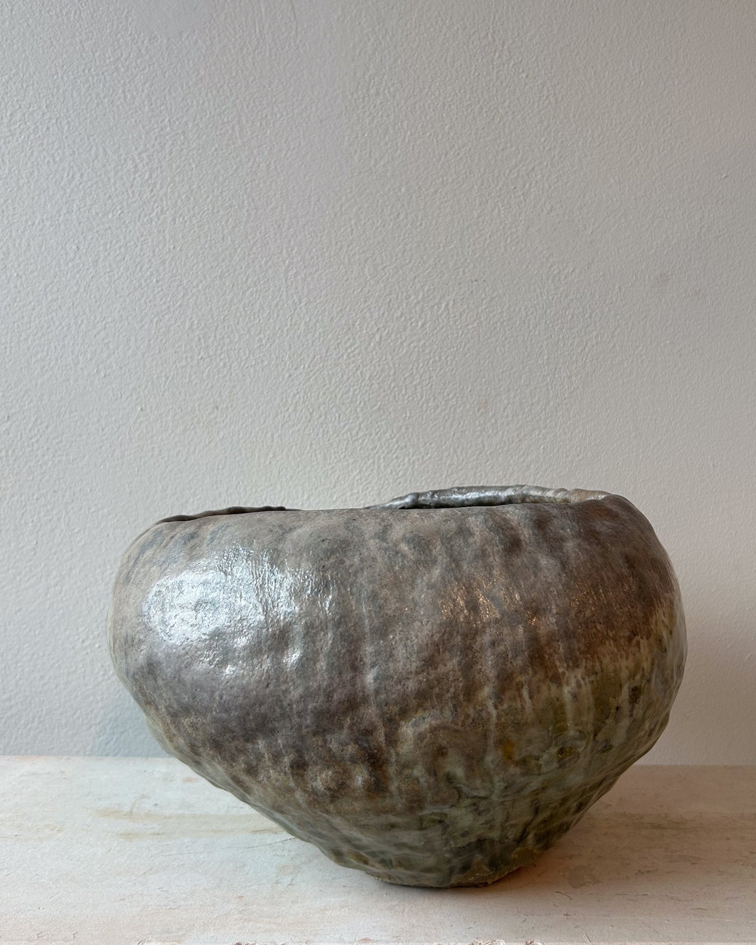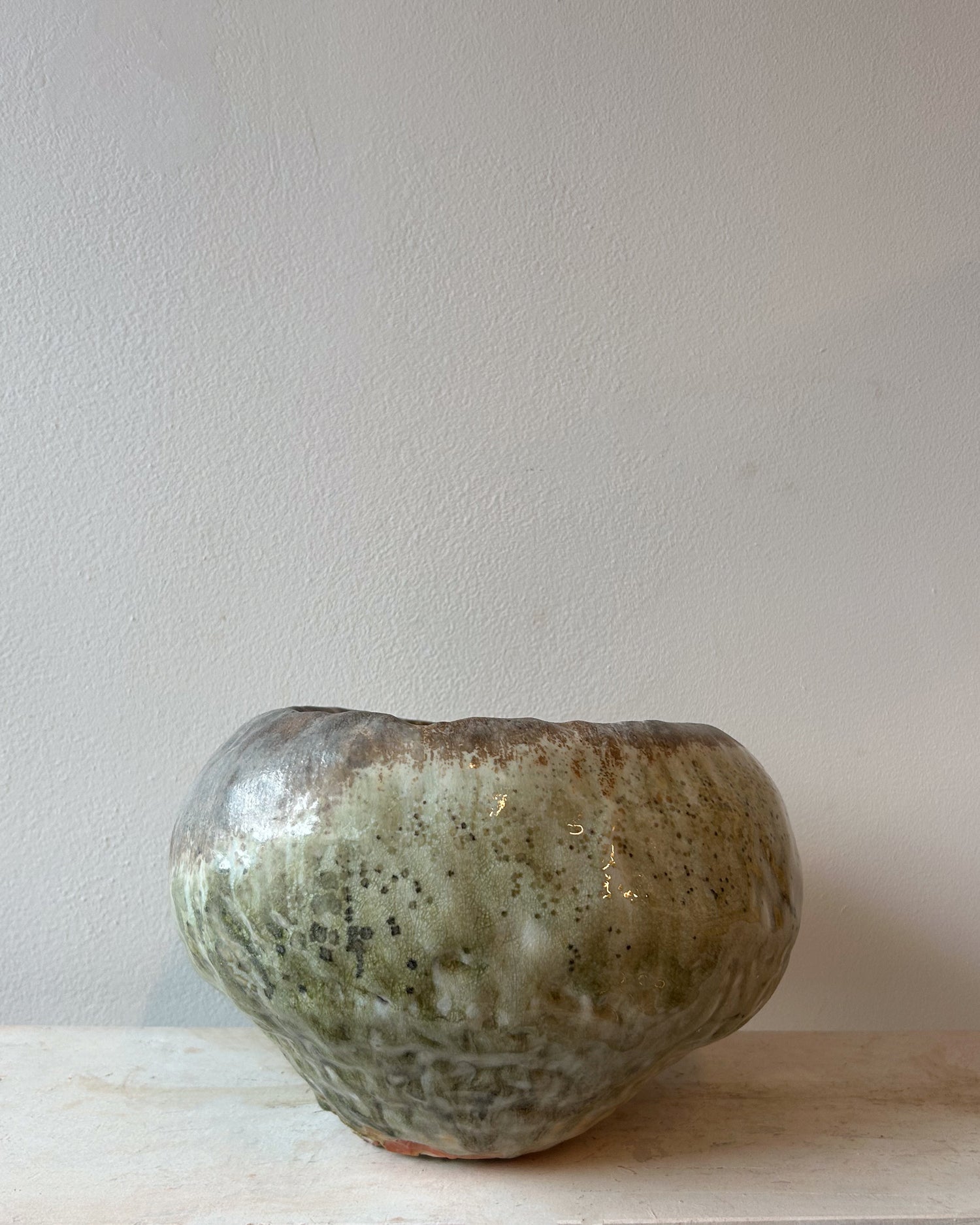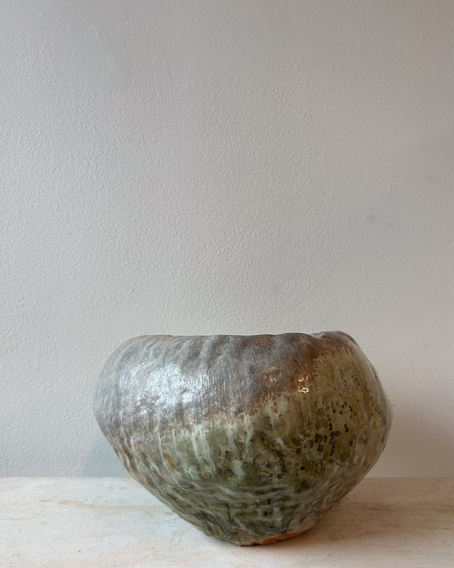 Glassy green gray gold surface  with ash throughout.